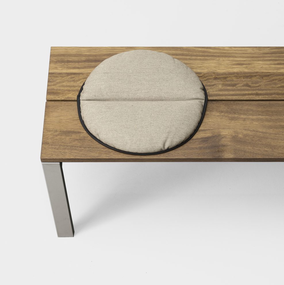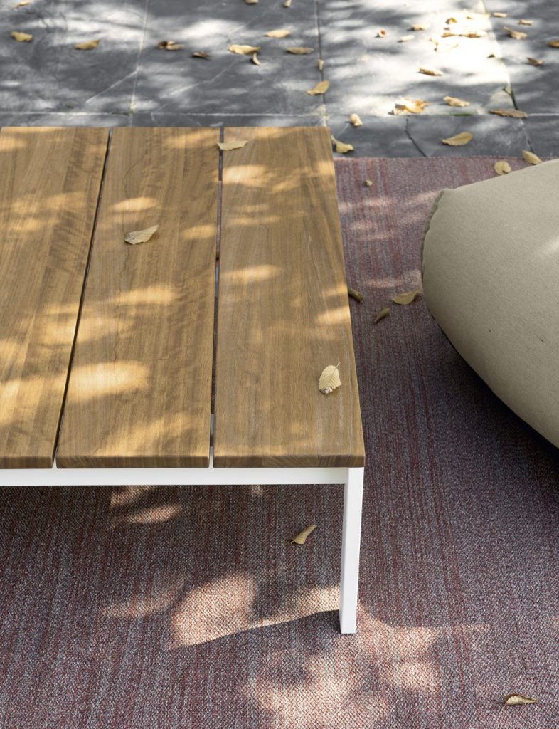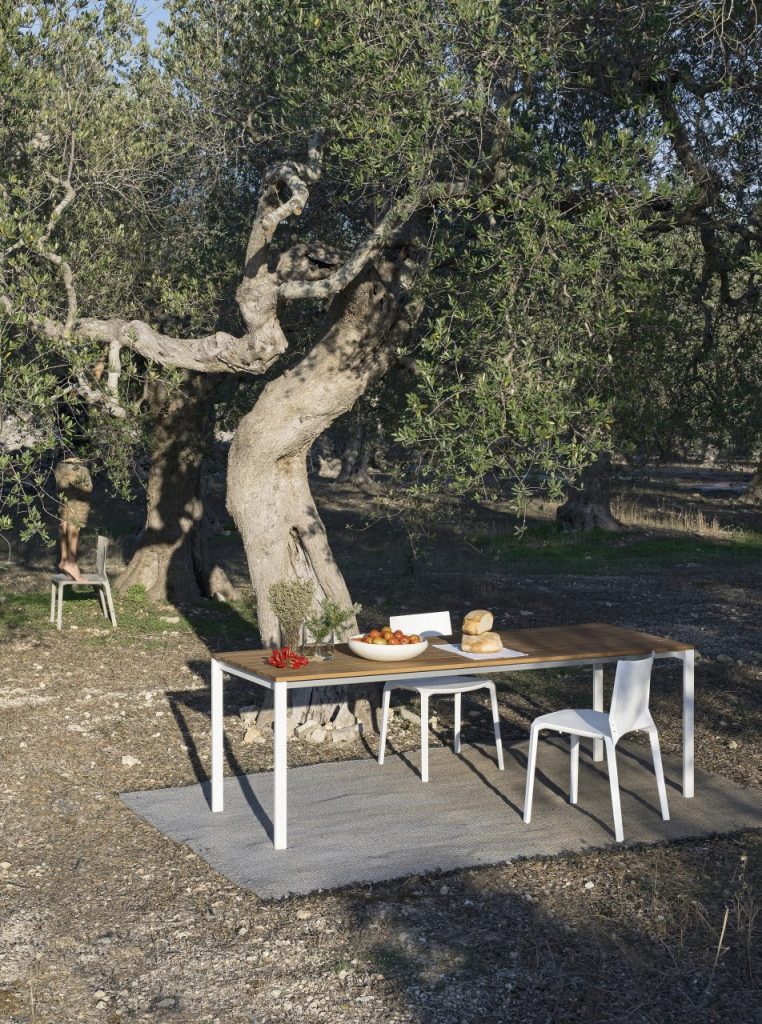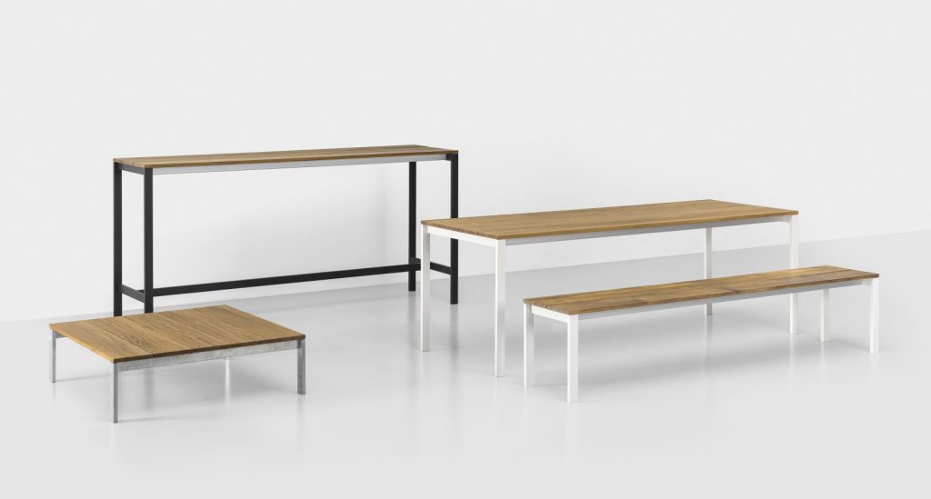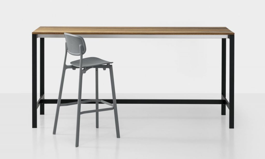 A complete collection of tables, benches and small tables for outdoor use, including a bar table or bar counter, in a simple versatile design, with crosspieces made of anodised aluminium. It has zinc-coated steel or powder-coated steel legs, also available in customised heights. The top, with 20 cm wide and 2 cm thick slats, is made of Teak wood from FSC certified plantations that respect the environment. It can be left to acquire a silvery colour over time, or treated with oil to maintain its natural shade.