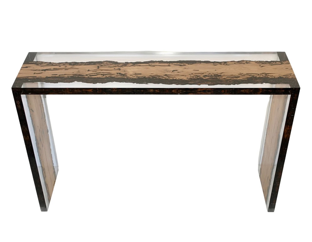 Bent _ Console is made with a single BRICCOLA solid OAK WOOD plank, extract from the Venice canals, preserved in EXTRACLEAR RESIN resembling the Lagoon water.