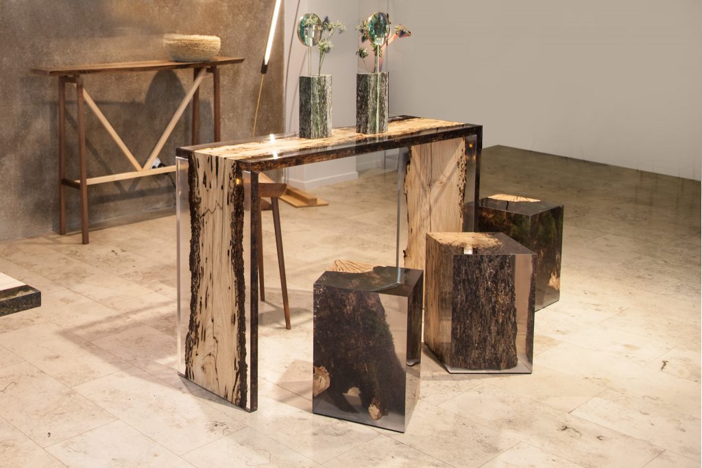 According to alcarol's idea of environmental cross-section, the pieces of Bricola Collection re-use and gives new life to Oak poles recovered in the Venice Lagoon. During the years in the canals, these poles are subjected to unremitting labour of lagoon molluscs and atmospheric agents that carve and sculpt the wood, so that each piece is unique. Using a patented and elaborated resination process, alcarol preserves intact the natural and peculiar live edges, filling the gaps and capturing the underwater air bubbles that bring the wood back to the original look and conditions. At the same time, the natural wood surface on the section planes is not not covered by resin, in order to guarantee a different experience of touch and sight, and to give their essential characteristics: warmth and matt porosity from natural wood, elegance and evocative transparency from the resin.