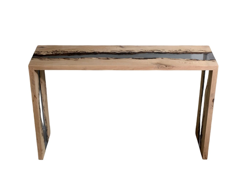 Bent River _ Console is made with a single BRICCOLA solid OAK WOOD plank, extract from the Venice canals, preserved in EXTRACLEAR RESIN resembling the Lagoon water. New alcarol's invisible corner joining ensures the continuity of both material, without visible separations between horizontal and vertical planes, like a single bent piece. The natural wood surface is not covered by resin on the section planes since alcarol always use a selective wood coating with a matt natural effect. According to alcarol's idea of environmental cross-section, the pieces of Bricola Collection re-use and gives new life to Oak poles recovered in the Venice Lagoon. During the years in the canals, these poles are subjected to unremitting  labour of lagoon molluscs and atmospheric agents that carve and sculpt the wood, so that each piece is unique. Using a patented and elaborated resination process, alcarol preserves intact the natural and peculiar live edges, filling the gaps and capturing the underwater air bubbles that bring the wood back to the original look and conditions.  At the same time, the natural wood surface on the section planes is not not covered by resin, in order to guarantee a different experience of touch and sight, and to give their essential characteristics: warmth and matt porosity from natural wood, elegance and evocative transparency from the resin.Bent River _ Console is made with a single BRICCOLA solid OAK WOOD plank, extract from the Venice canals, preserved in EXTRACLEAR RESIN resembling the Lagoon water. New alcarol's invisible corner joining ensures the continuity of both material, without visible separations between horizontal and vertical planes, like a single bent piece. The natural wood surface is not covered by resin on the section planes since alcarol always use a selective wood coating with a matt natural effect. According to alcarol's idea of environmental cross-section, the pieces of Bricola Collection re-use and gives new life to Oak poles recovered in the Venice Lagoon. During the years in the canals, these poles are subjected to unremitting  labour of lagoon molluscs and atmospheric agents that carve and sculpt the wood, so that each piece is unique. Using a patented and elaborated resination process, alcarol preserves intact the natural and peculiar live edges, filling the gaps and capturing the underwater air bubbles that bring the wood back to the original look and conditions.  At the same time, the natural wood surface on the section planes is not not covered by resin, in order to guarantee a different experience of touch and sight, and to give their essential characteristics: warmth and matt porosity from natural wood, elegance and evocative transparency from the resin.Bent River _ Console is made with a single BRICCOLA solid OAK WOOD plank, extract from the Venice canals, preserved in EXTRACLEAR RESIN resembling the Lagoon water. New alcarol's invisible corner joining ensures the continuity of both material, without visible separations between horizontal and vertical planes, like a single bent piece. The natural wood surface is not covered by resin on the section planes since alcarol always use a selective wood coating with a matt natural effect. According to alcarol's idea of environmental cross-section, the pieces of Bricola Collection re-use and gives new life to Oak poles recovered in the Venice Lagoon. During the years in the canals, these poles are subjected to unremitting  labour of lagoon molluscs and atmospheric agents that carve and sculpt the wood, so that each piece is unique. Using a patented and elaborated resination process, alcarol preserves intact the natural and peculiar live edges, filling the gaps and capturing the underwater air bubbles that bring the wood back to the original look and conditions.  At the same time, the natural wood surface on the section planes is not not covered by resin, in order to guarantee a different experience of touch and sight, and to give their essential characteristics: warmth and matt porosity from natural wood, elegance and evocative transparency from the resin.Bent River _ Console is made with a single BRICCOLA solid OAK WOOD plank, extract from the Venice canals, preserved in EXTRACLEAR RESIN resembling the Lagoon water. New alcarol's invisible corner joining ensures the continuity of both material, without visible separations between horizontal and vertical planes, like a single bent piece. The natural wood surface is not covered by resin on the section planes since alcarol always use a selective wood coating with a matt natural effect. According to alcarol's idea of environmental cross-section, the pieces of Bricola Collection re-use and gives new life to Oak poles recovered in the Venice Lagoon. During the years in the canals, these poles are subjected to unremitting  labour of lagoon molluscs and atmospheric agents that carve and sculpt the wood, so that each piece is unique. Using a patented and elaborated resination process, alcarol preserves intact the natural and peculiar live edges, filling the gaps and capturing the underwater air bubbles that bring the wood back to the original look and conditions.  At the same time, the natural wood surface on the section planes is not not covered by resin, in order to guarantee a different experience of touch and sight, and to give their essential characteristics: warmth and matt porosity from natural wood, elegance and evocative transparency from the resin.