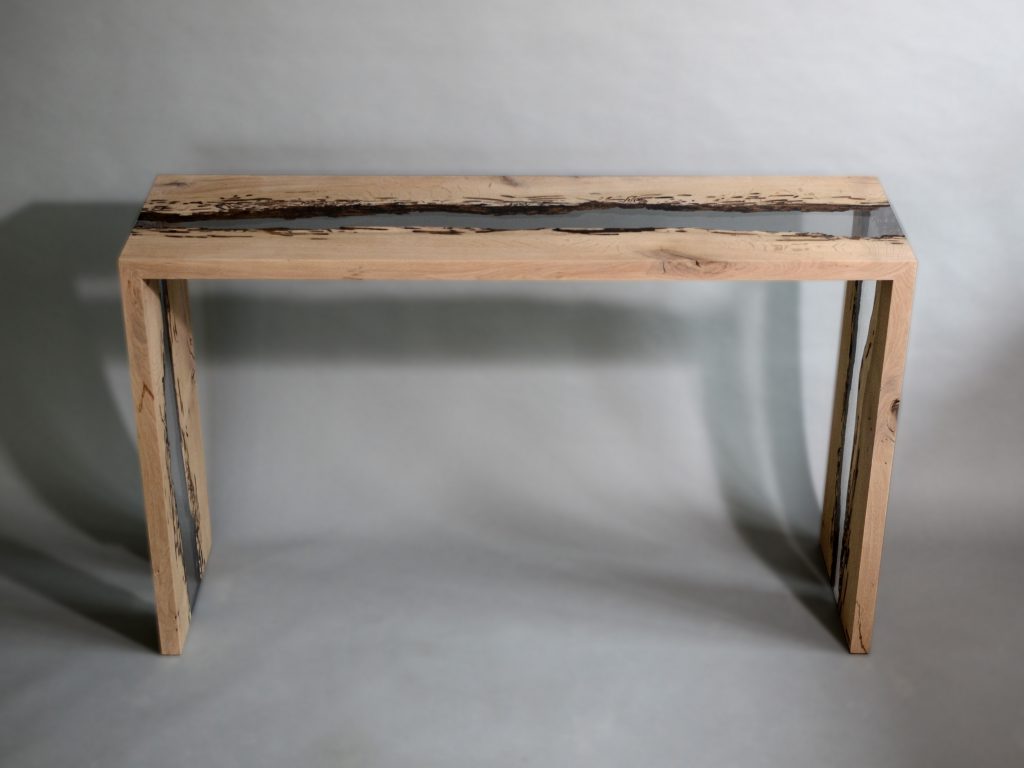 Bent River Console with an elongated shape, made of solid wood with a natural finish and featuring a transparent resin inlay, set against a gray background.