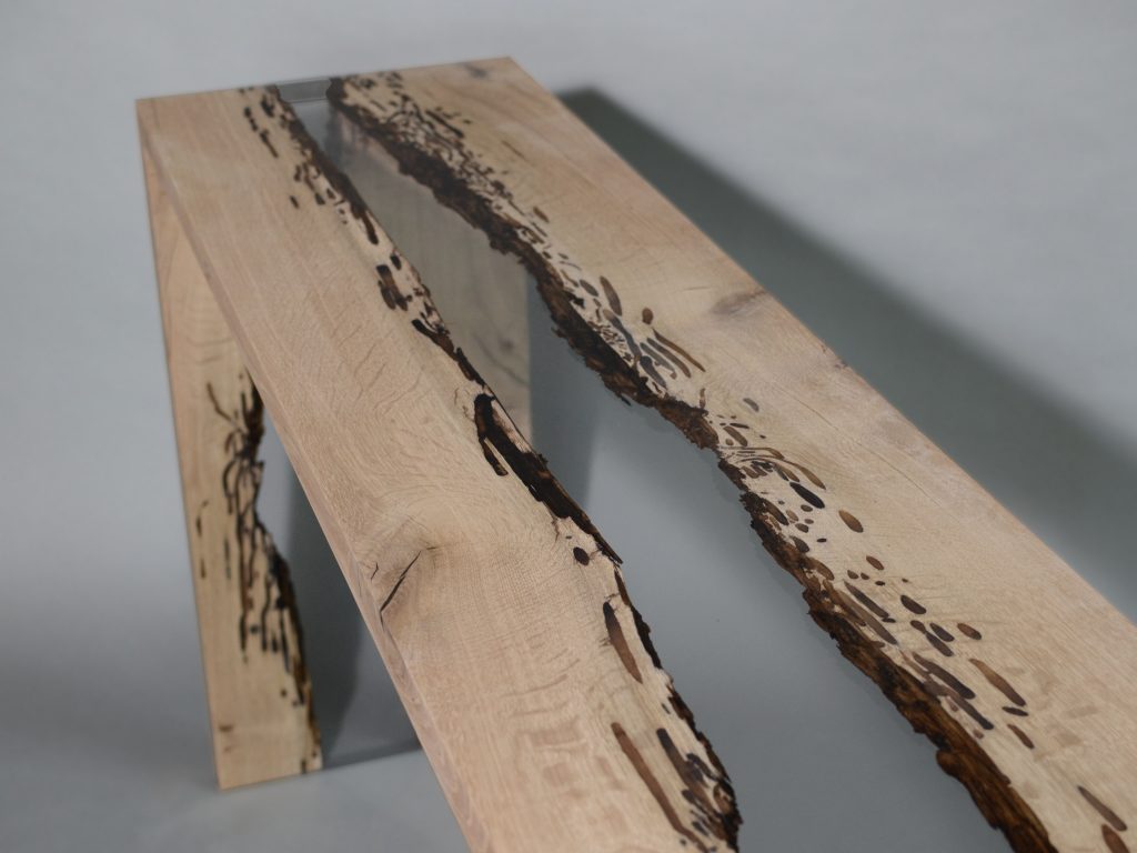 According to alcarol's idea of environmental cross-section, the pieces of Bricola Collection re-use and gives new life to Oak poles recovered in the Venice Lagoon. During the years in the canals, these poles are subjected to unremitting labour of lagoon molluscs and atmospheric agents that carve and sculpt the wood, so that each piece is unique. Using a patented and elaborated resination process, alcarol preserves intact the natural and peculiar live edges, filling the gaps and capturing the underwater air bubbles that bring the wood back to the original look and conditions. At the same time, the natural wood surface on the section planes is not not covered by resin, in order to guarantee a different experience of touch and sight, and to give their essential characteristics: warmth and matt porosity from natural wood, elegance and evocative transparency from the resin.
