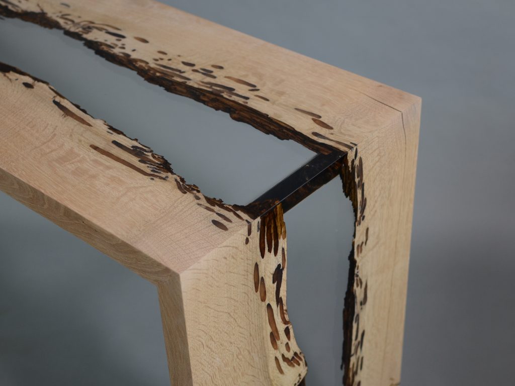 Bent River _ Console is made with a single BRICCOLA solid OAK WOOD plank, extract from the Venice canals, preserved in EXTRACLEAR RESIN resembling the Lagoon water.