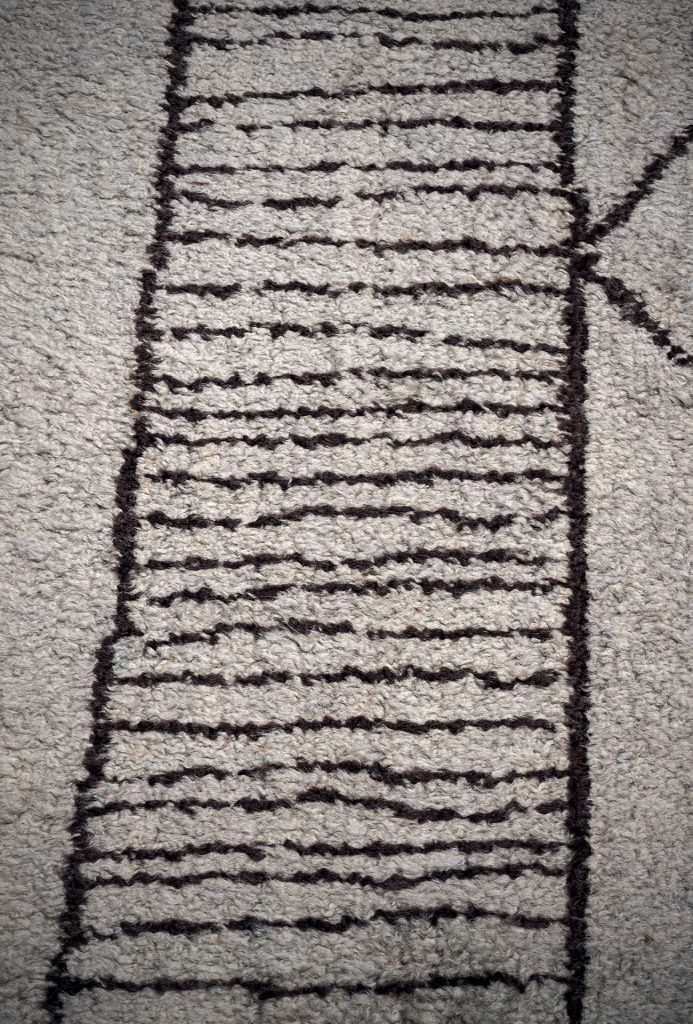 This rug is completely hand-knotted on traditional vertical looms in hand-spun wool, following the features of the Berber-Moroccan rugs of the beginning of '900. The ?nishing process is very elaborate: after the ?rst shave and the handwash, every single rug is handled in order to create a unique product: a skilled craftsman works on the surface with scissors, in order to give it the typical irregularities of the original rugs. On one side a selvage is created, matching with the design pattern and decorated with a woolen stitching. On the other side, fringes are woven one by one, following the style of the old Berber rugs. The b/w version is carried out through the use of non-dyed wools, while the other versions involve the use of vegetable dyes. For the standard maintenance of rugs, vacuum regularly with rotating brushes to remove dust and other residues. To remove stains use a suitable professional non-powder detergent, without applying it directly on the stain, but rather in small quantities on a cloth. For stains on wool rugs use special pH-neutral products, taking care to remove any residue. The area concerned should then be dried as much as possible with a clean cloth. To wash it is advisable to consult a specialist dry cleaner.