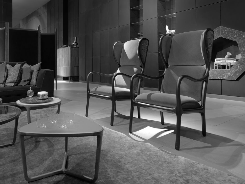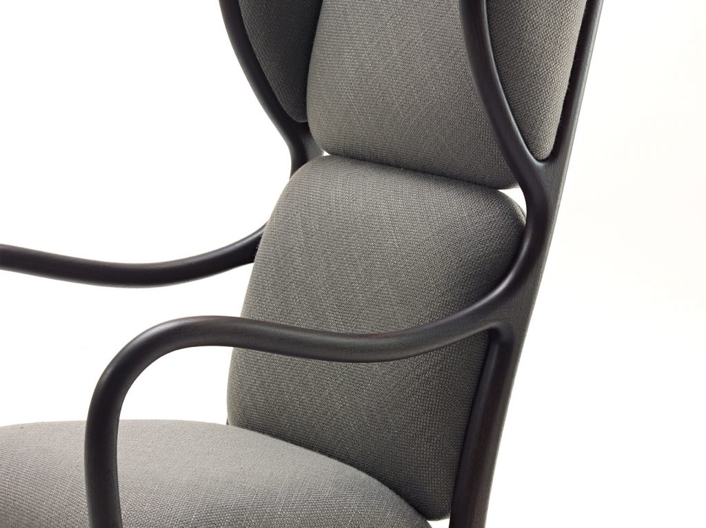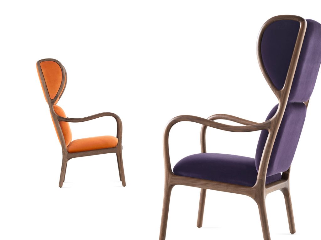Armchair and pouf made in solid American walnut, seat and back-rest in upholstered plywood.