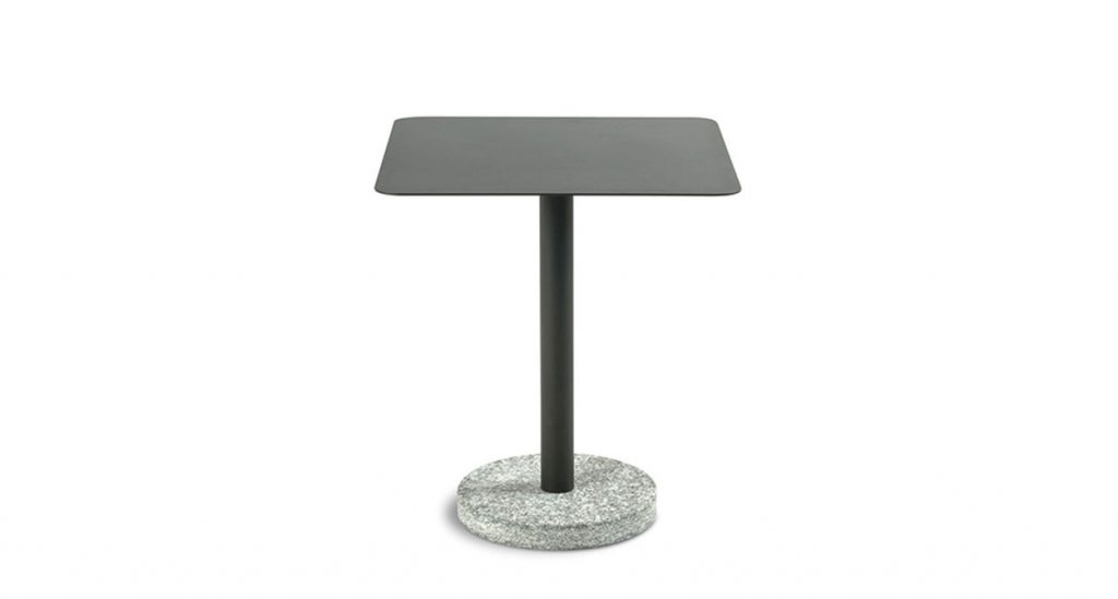 An outdoor side table made from metal, powder coated gray. Table sits on a tubular metal structure in matching finish. Base made from natural stone.