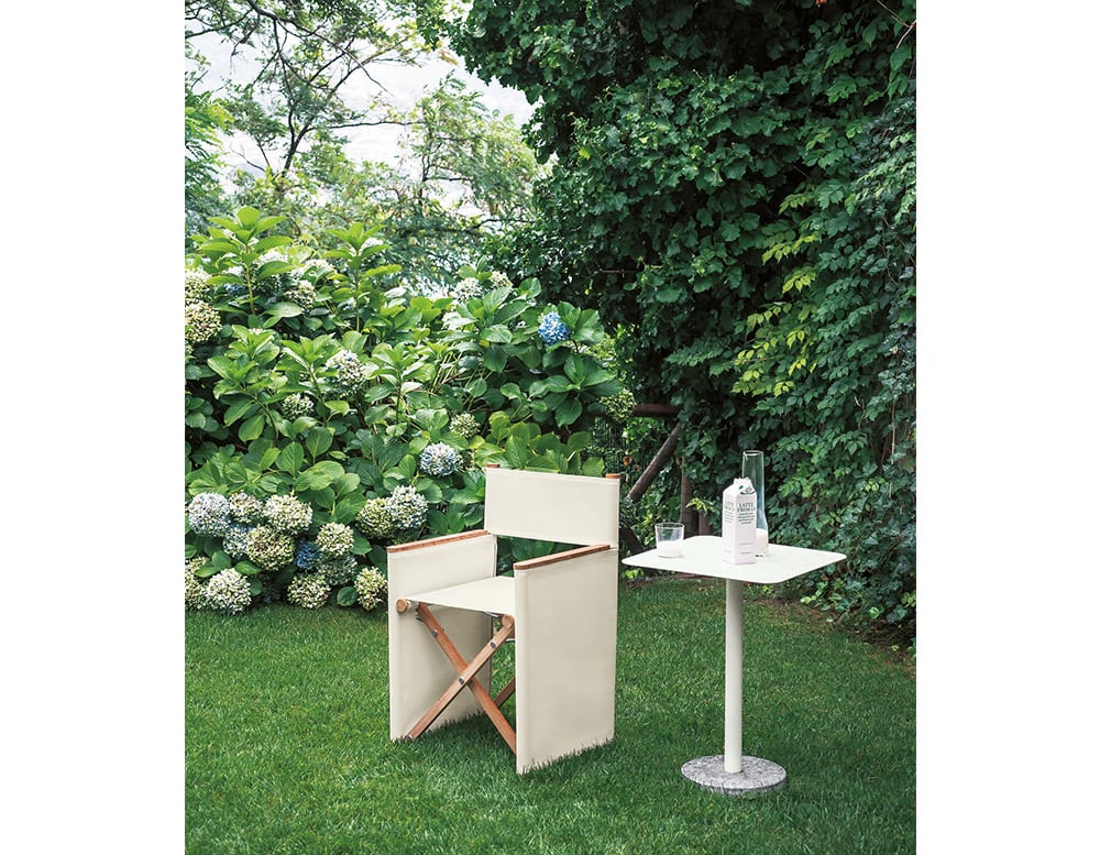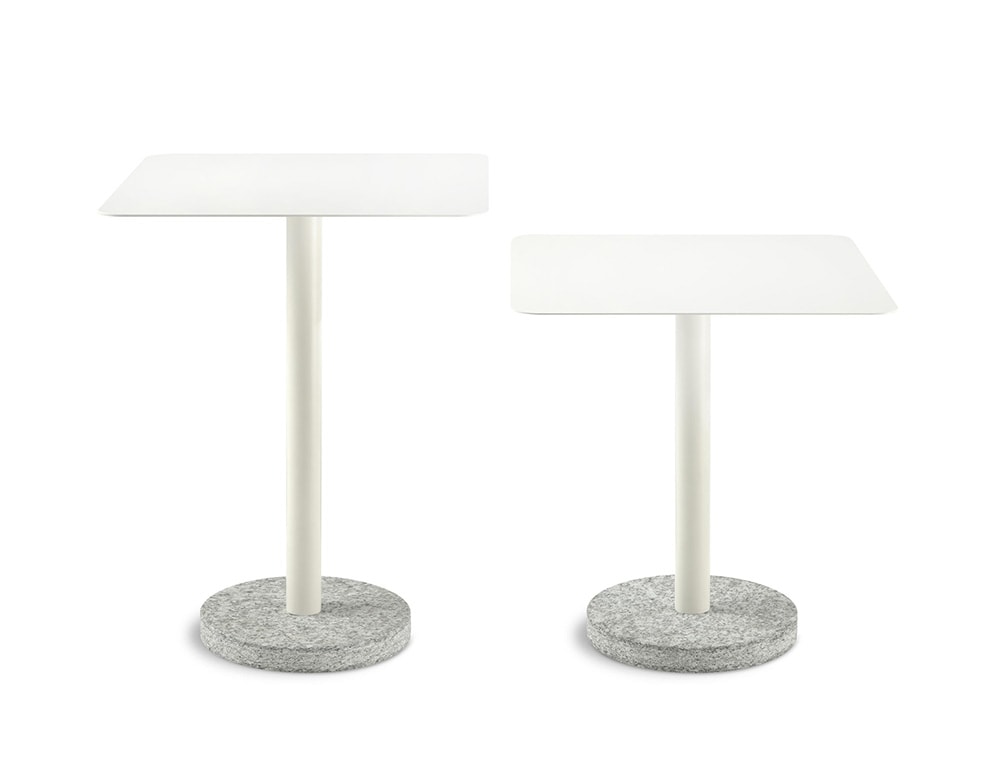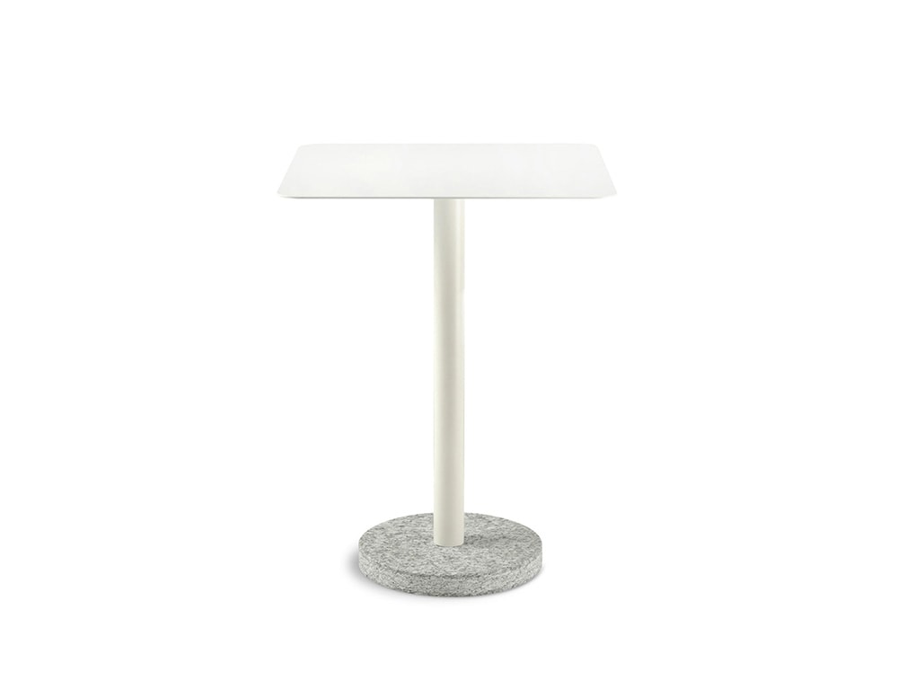 An outdoor side table made from metal, powder coated gray. Table sits on a tubular metal structure in matching finish. Base made from natural stone.