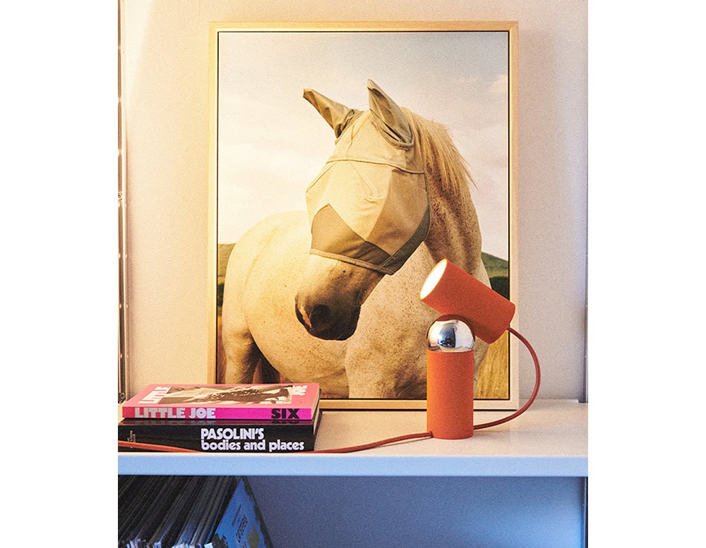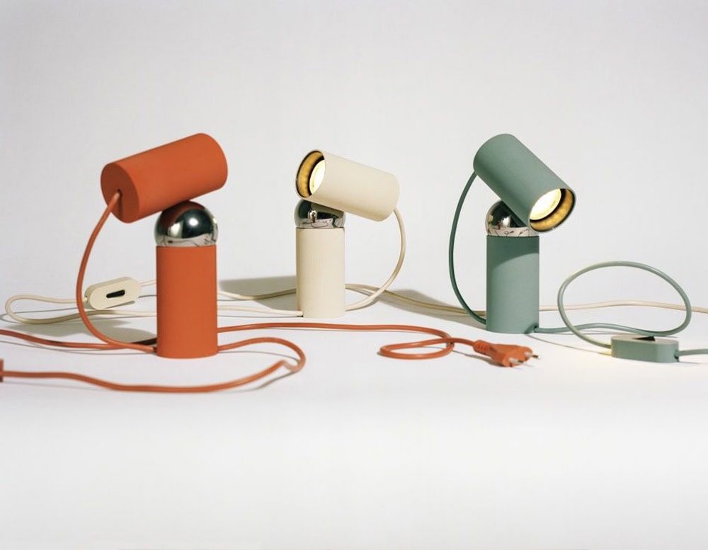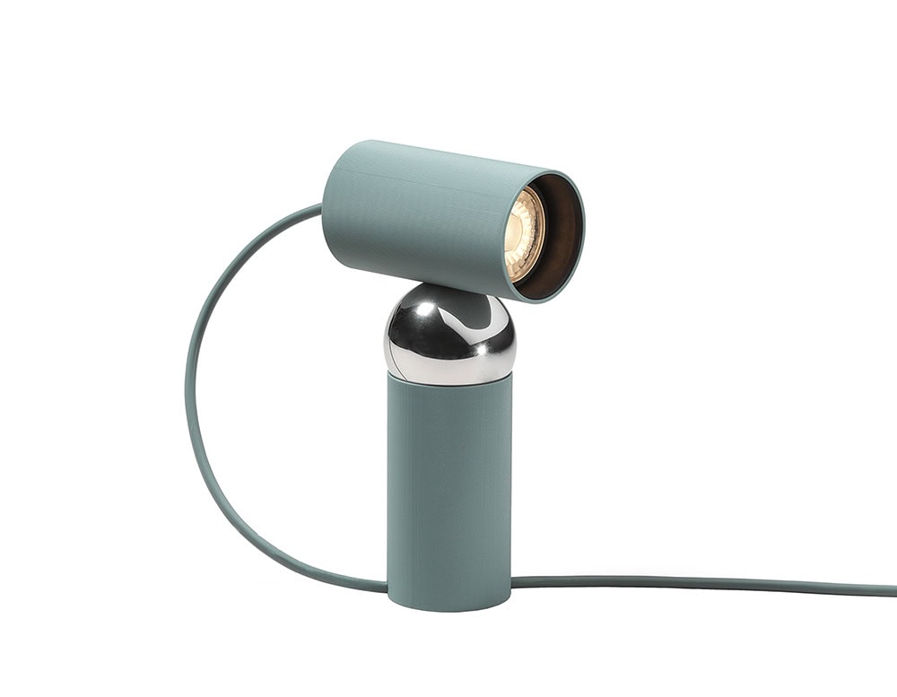 This table lamp features an adjustable head with an integrated LED bulb and cut-off for direct lighting. Its body is made from pigmented polycarbonate sourced from paper production by-products instead of petroleum. Adjustability is provided by a steel sphere with protective PVD coating. The 2-meter cable can be adjusted and locked in place through a slit in the base. Designed to ISCC standards, the lamp is assembled without glued components for easy disassembly and full recyclability.
