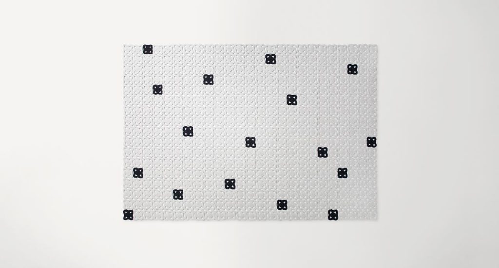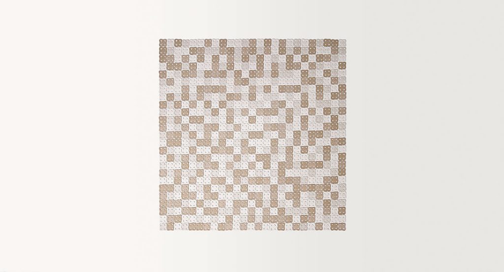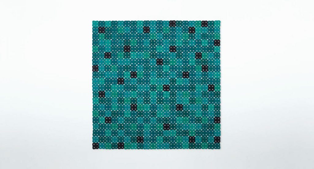 This modular rug for exterior and interior environments is created by joining elements made of one- or two-colour cords. The cord is shaped and sewn by hand to create decorating modules of about 12x12 cm. These elements are then sewn with an orthogonal placement to form the rugs surface. The handwork and the preciousness of the designs lead the Company to advise against the use of Bisanzio in high traffic areas. Only one colour can be chosen.
