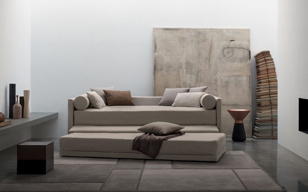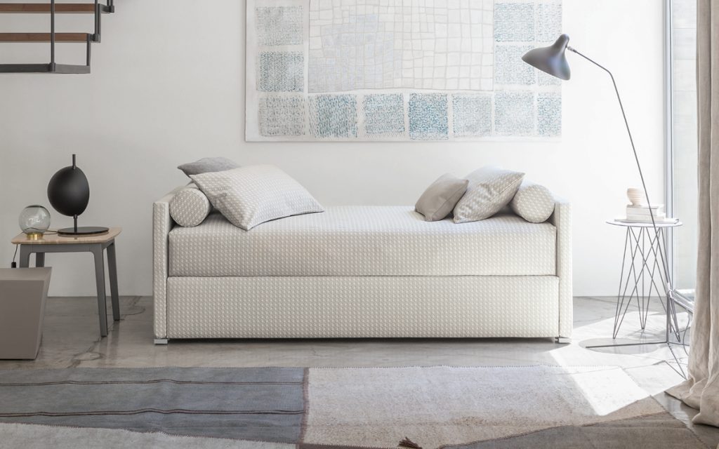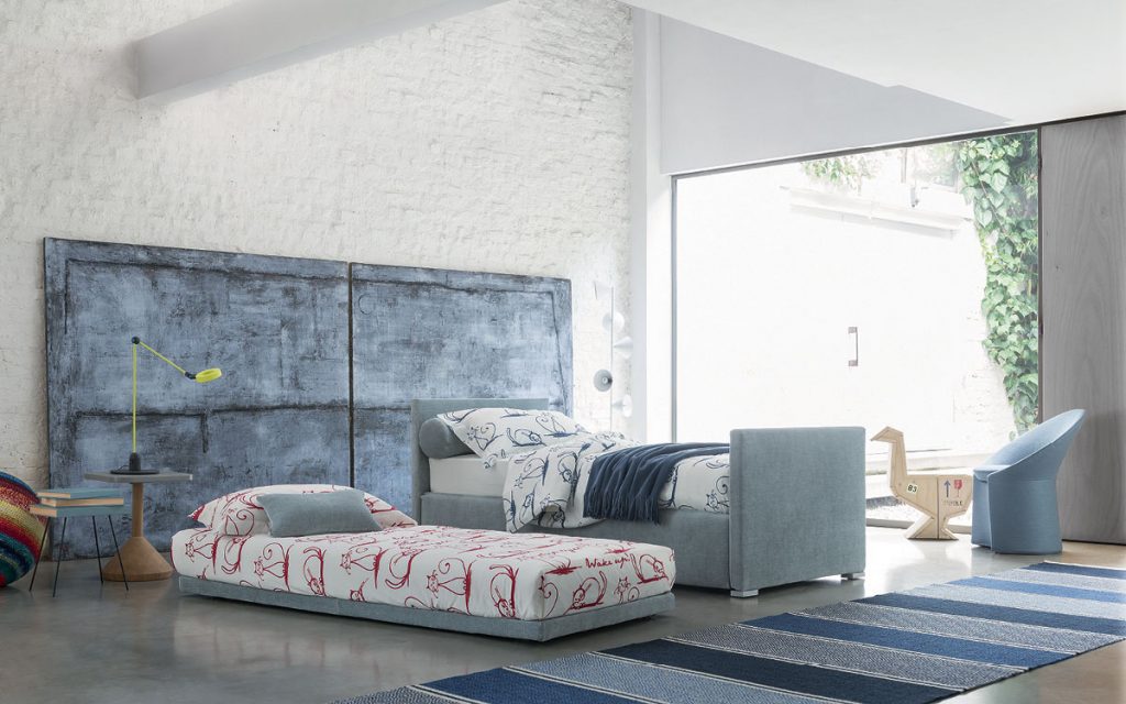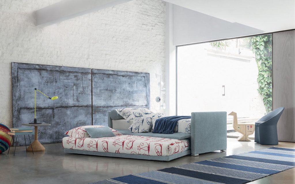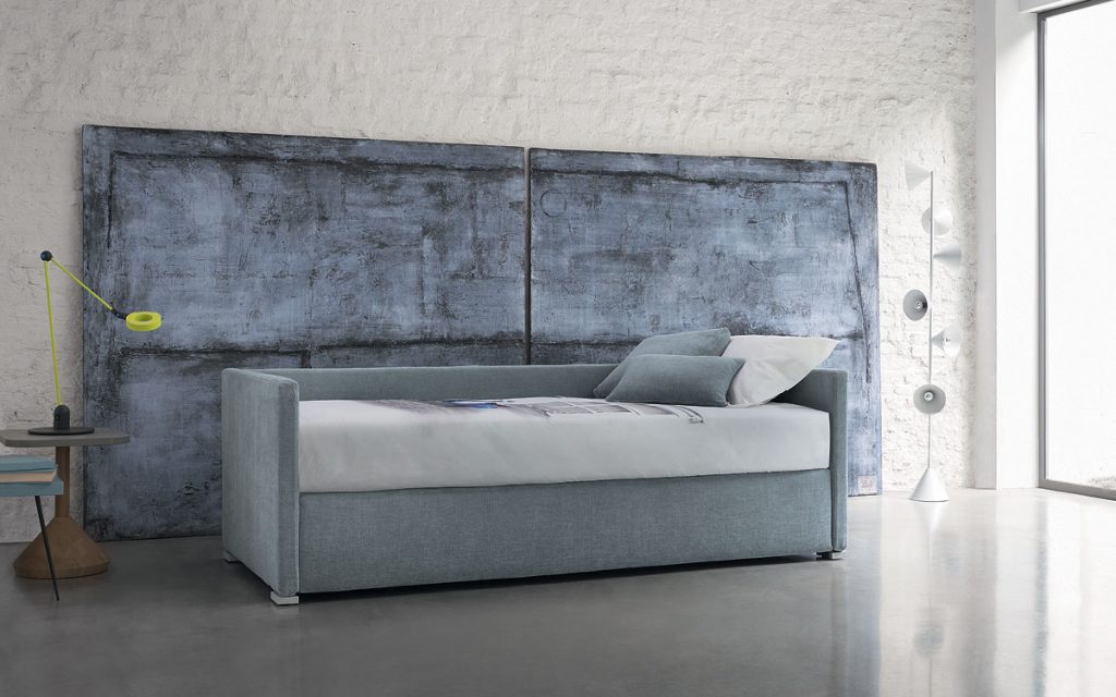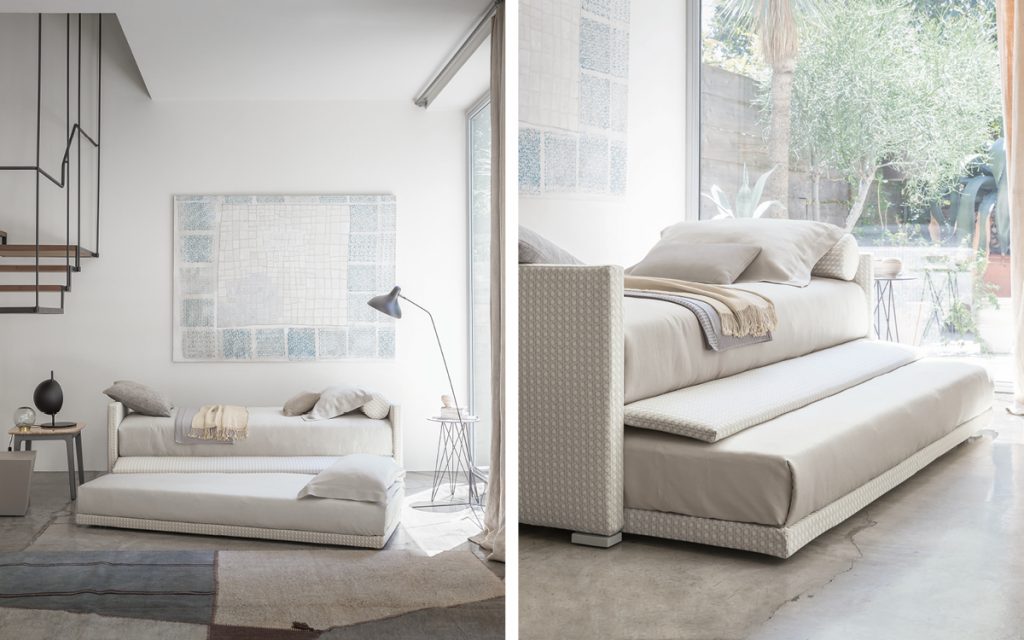Biss is a versatile single bed available in two versions: base with storage (opening on the right or on the left) and base with one side which can be opened and used to contain the second bed (without headboard). This second bed has wheels and can be either raised thanks to a gas piston mechanism or remain at floor level (version without mechanism). The mattress support has slats with rigidity adjustment. All the covers in fabric, Ecopelle or leather are removable thanks to velcro fastening. Backrests are also available: high, low or shaped (right or left).