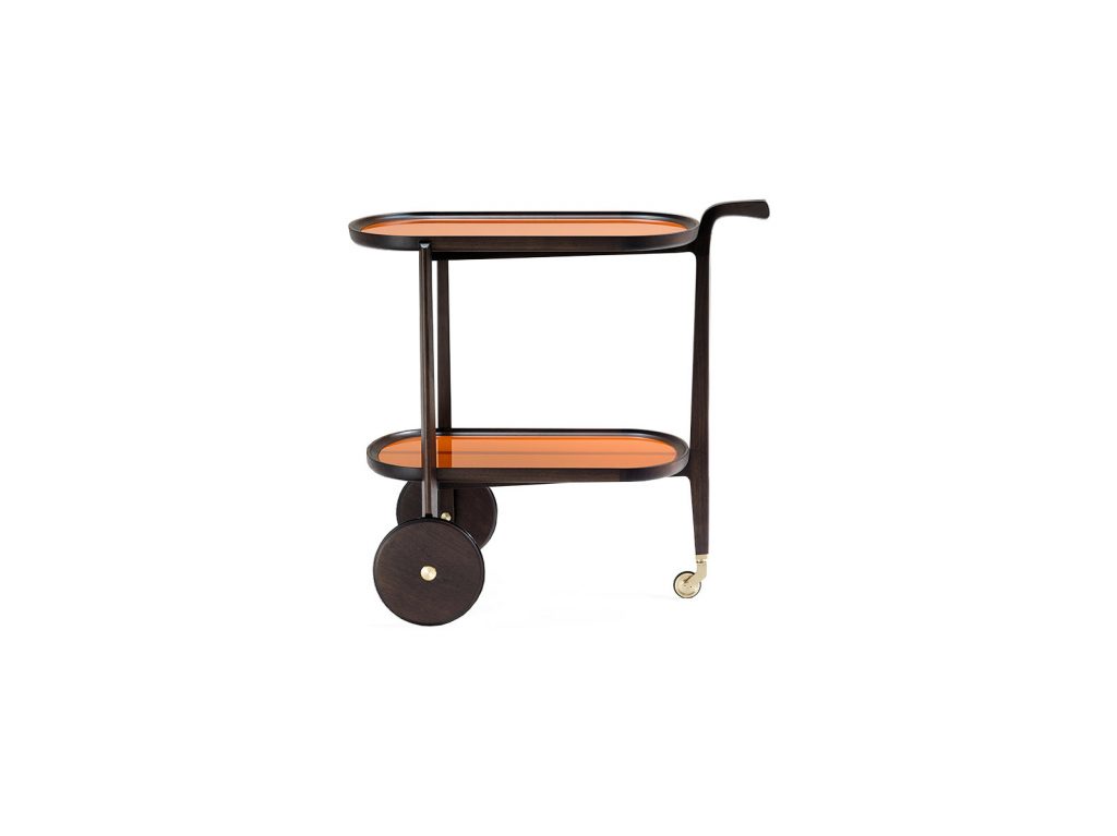 Trolley in solid american walnut with 1 removable tray. Trays top in wood or in coloured glass, hardware in brass.