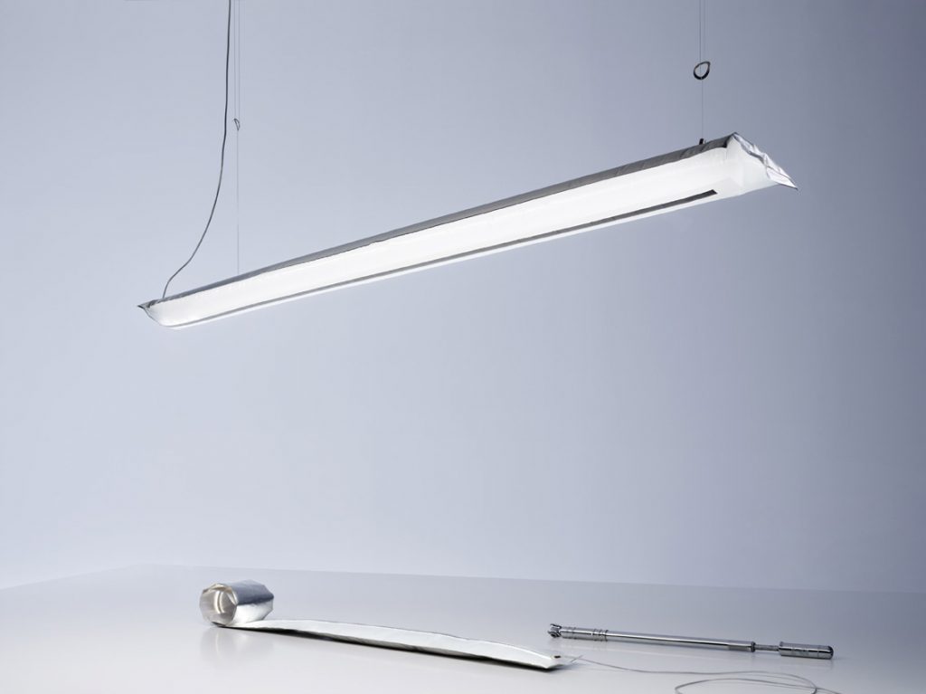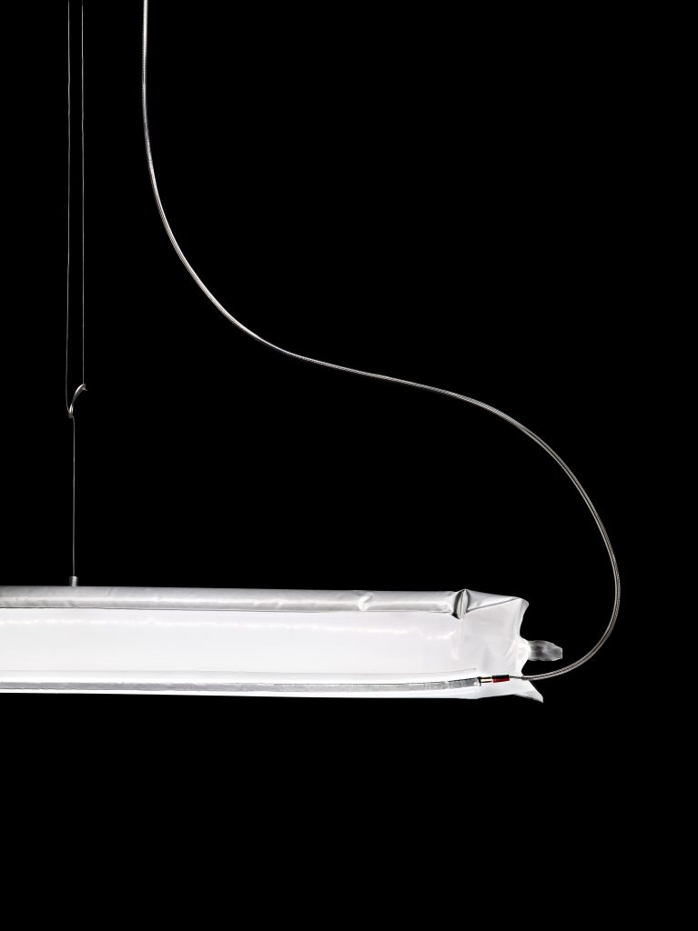 The inflatable tube Blow Me Up by Theo Möller, Ingo Maurer & Team was first presented at Euroluce 2017. It is flexible to use: You can lean it against a wall, fasten it to the ceiling or wall with small hooks and nylon cords. It comes wrapped up in a box and is pumped up by the user. The LED-strip illuminates the reflecting side of the tube, thus dispersing indirect light into the room. Since summer 2018 on, Blow Me Up will be available in two sizes, 120 and 180 cm with the option to choose in between four colours. The standard version has LEDs with 3000 K and a CRI above 90 Ra. Material: plastic.