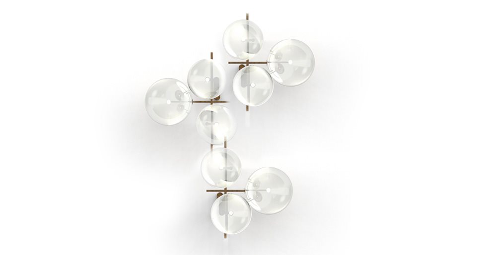 Wall or ceiling fitted lamp with hand burnished brass structure, available with 3 transparent mouth-blown glass spheres. Supplied with light bulbs (LED).