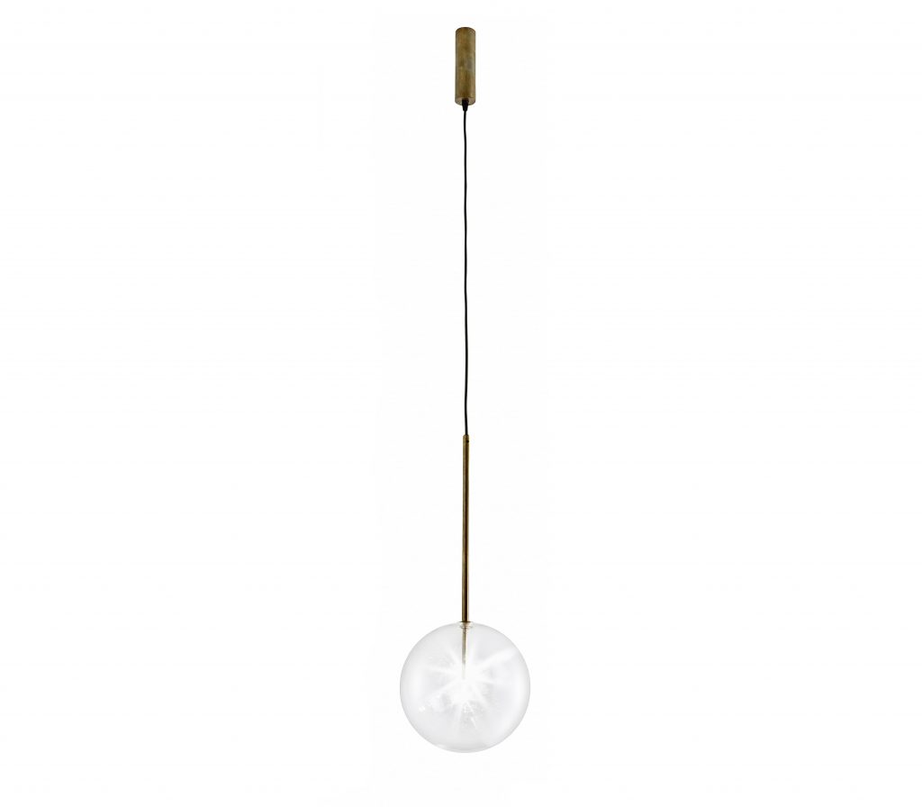 Hanging lamp with LED point light (G4 2700 Kelvin). Transparent blown glass sphere. Metal parts in hand burnished brass.The hand burnished brass finish looks naturally spotted and irregular. Due to this craft made processing, each product is unique and exclusive. Not dimmable light. Supplied with cable 4mt long.