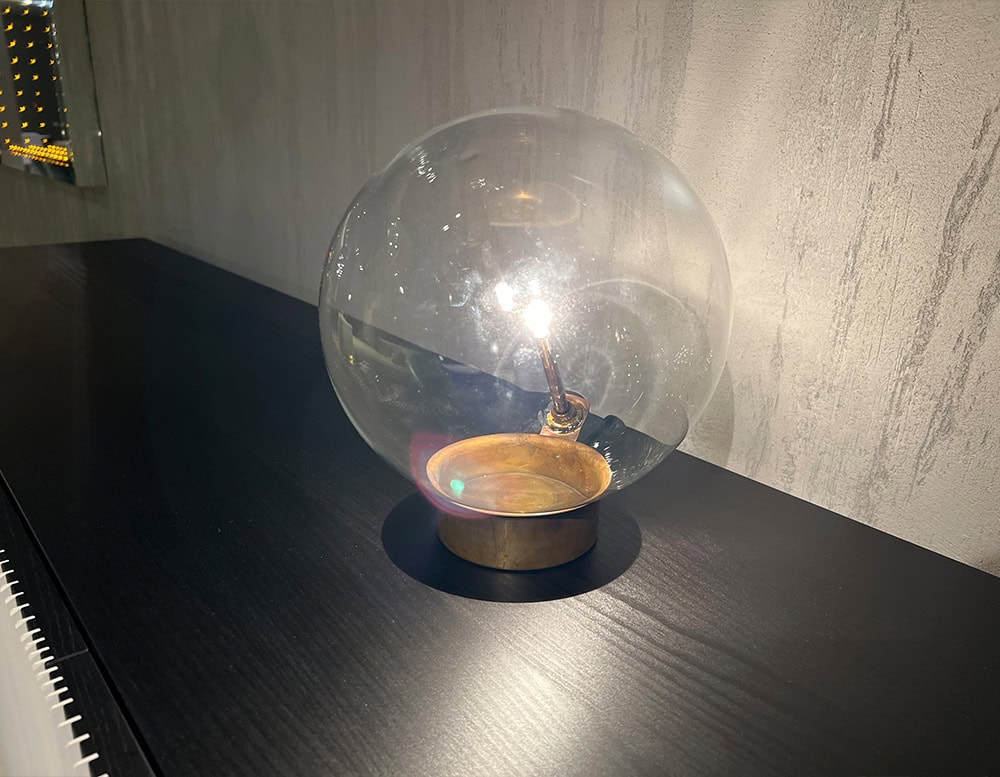 Table lamp with transparent blown glass diffuser. Metal parts in hand burnished brass. 20W Halogen 110V. Dimmable.