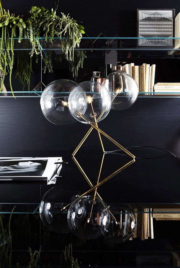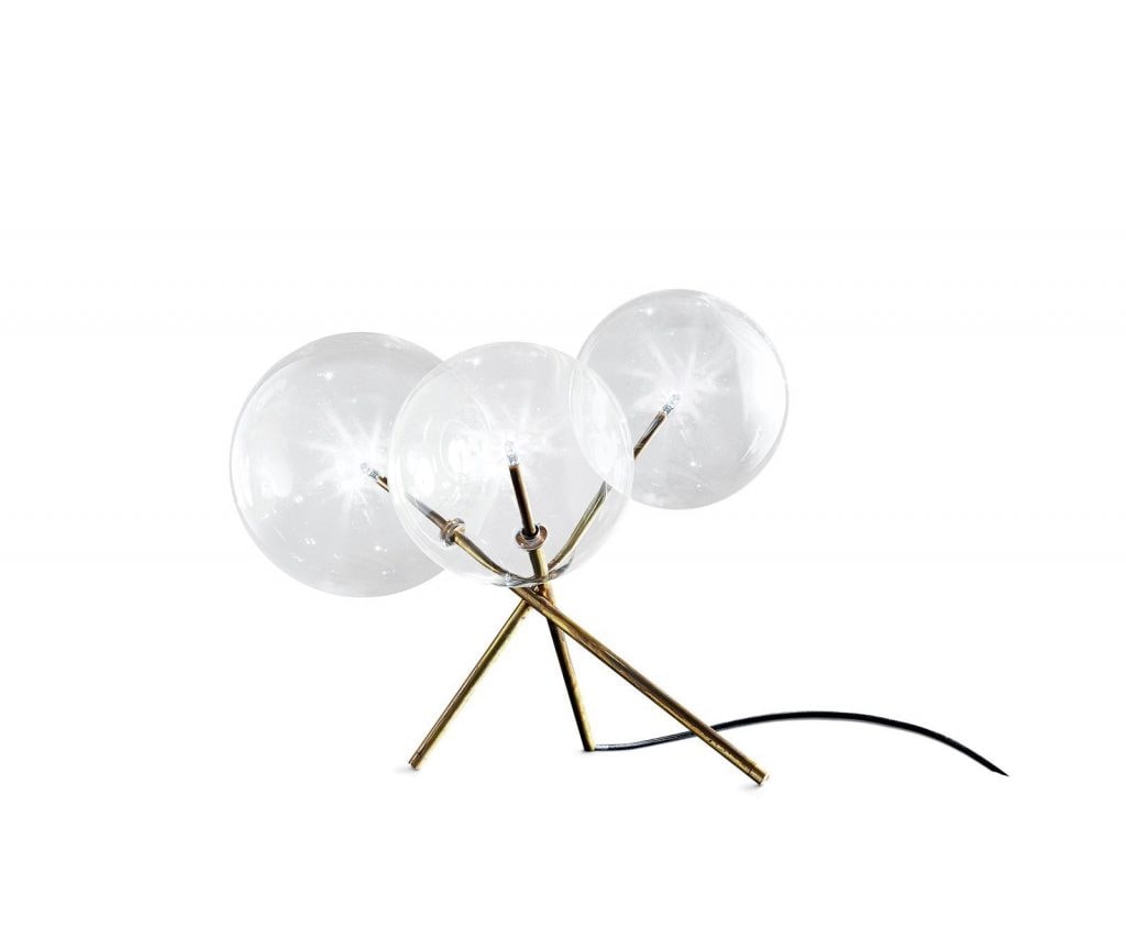 Table lamp with transparent blown glass diffusers. Metal parts in hand-burnished brass. Consists of 3x dimmable 20W Halogen 110V. The hand burnished brass finish looks naturally spotted and irregular. Due to this craft made processing, each product is unique and exclusive.