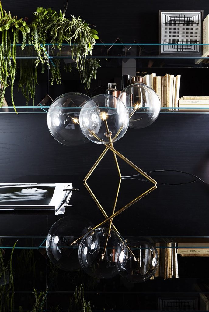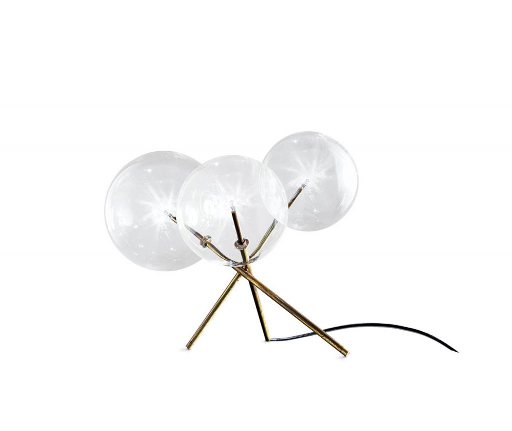 Table lamp with LED point light (G4 2700 Kelvin). Transparent blown glass spheres. Metal parts in hand burnished brass. The hand burnished brass finish looks naturally spotted and irregular. Due to this craft made processing, each product is unique and exclusive. Dimmable light.