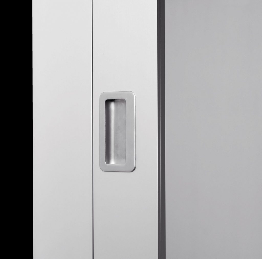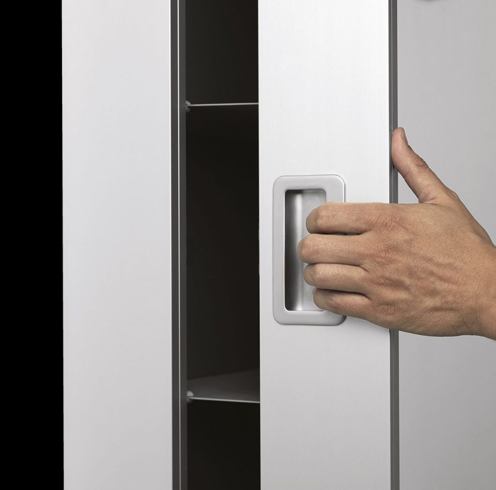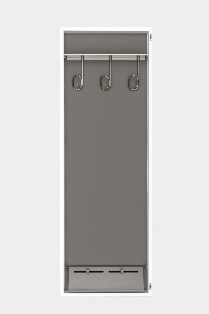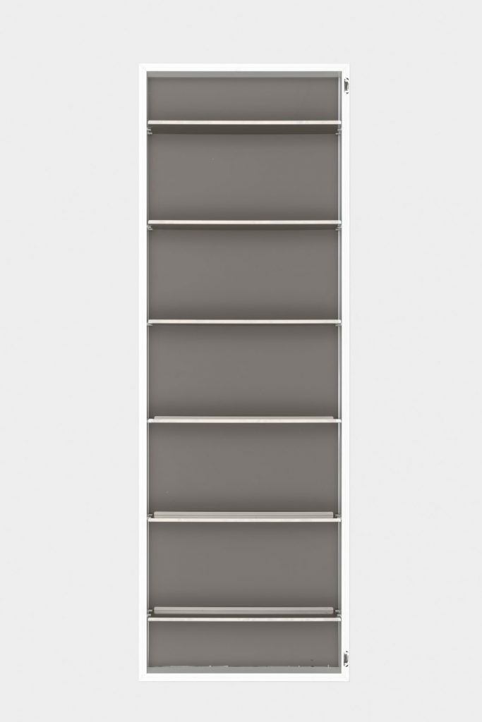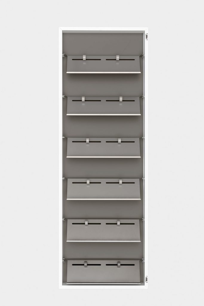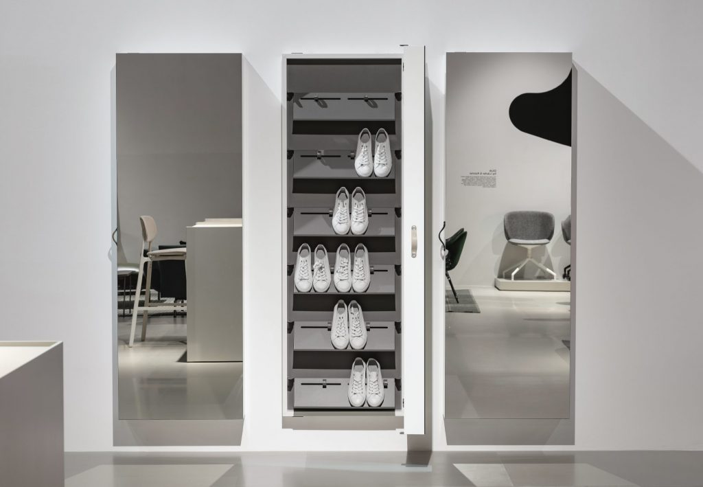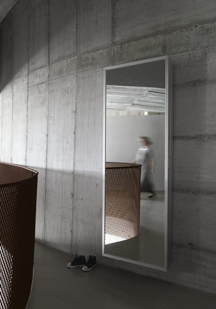 Box is a simple multifunctional wall cabinet. The result of the creative talent of Luciano Bertoncini, it features minimalist aesthetic appeal and great versatility for use. The frame, in light hardwearing aluminium, frames a mirror door that conceals multipurpose shelves, clothes hooks and shoe racks. In the BoxOne version, the door has a full-length mirror and opens with an external handle, in a choice of black or natural Presot® hide or soft opaline silicone. Like the previous version, the door opens to 180° and has concealed hinges. Compact and minimalist, Box and BoxOne are designed to complement any room in the home, from the bathroom to the entrance hall and the bedroom.