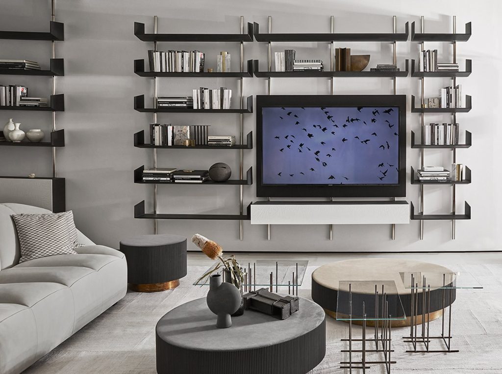 Wall shelving system with satin nickel-plated brass vertical supports. Clay stained or black open pore lacquered ash shelves. Door or flap door units with hand decorated tempered glass fronts in deco' or craquelé finish. Available also with painted glass fronts as per sample in the bright or satin version. With clay stained or black open pore lacquered ash tv Panel, on request. LED tv panel (30 Watt) to be switched on with remote control.