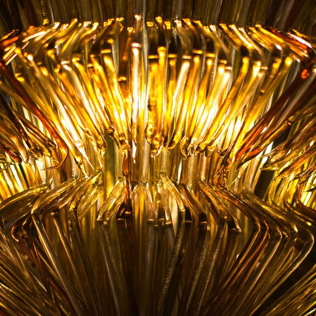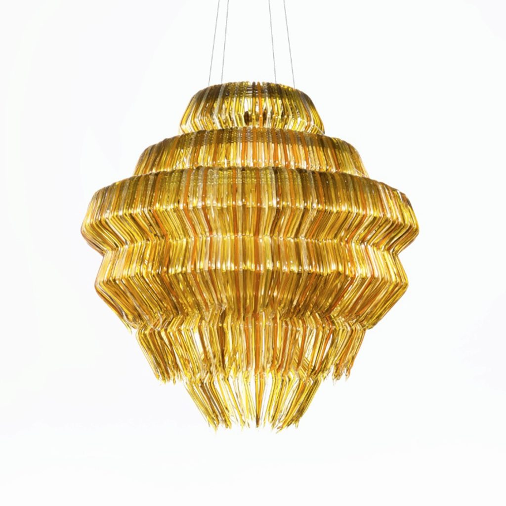 Brilli Model G is a fantastic, daring and colorful design by Italian artist Jacopo Foggini. Working with a machine of his own invention, Foggini heats methacrylate to volcanic temperatures to create thick, colorful threads. Then, he molds the polymer derivate by hand into lit artworks.