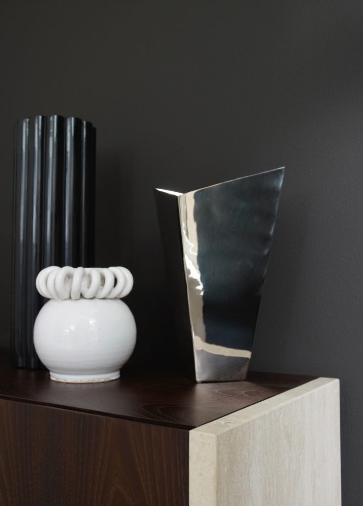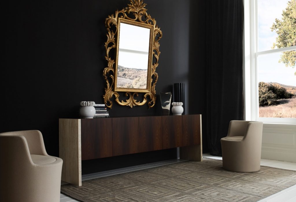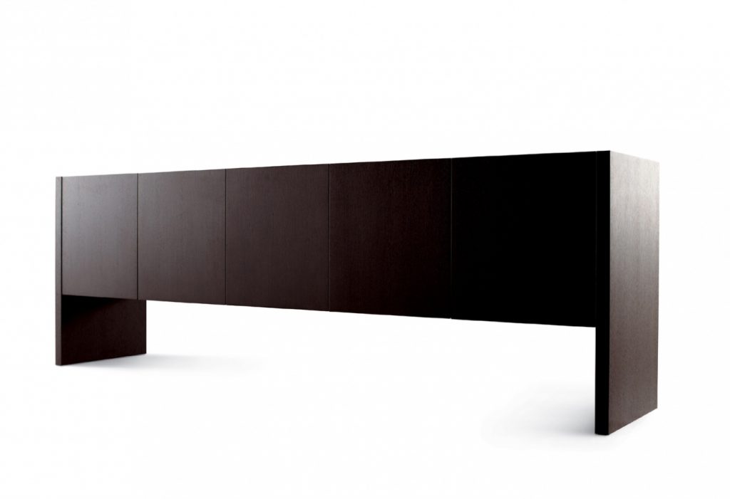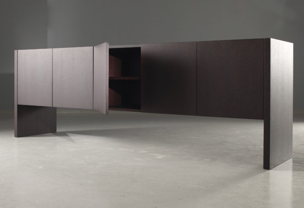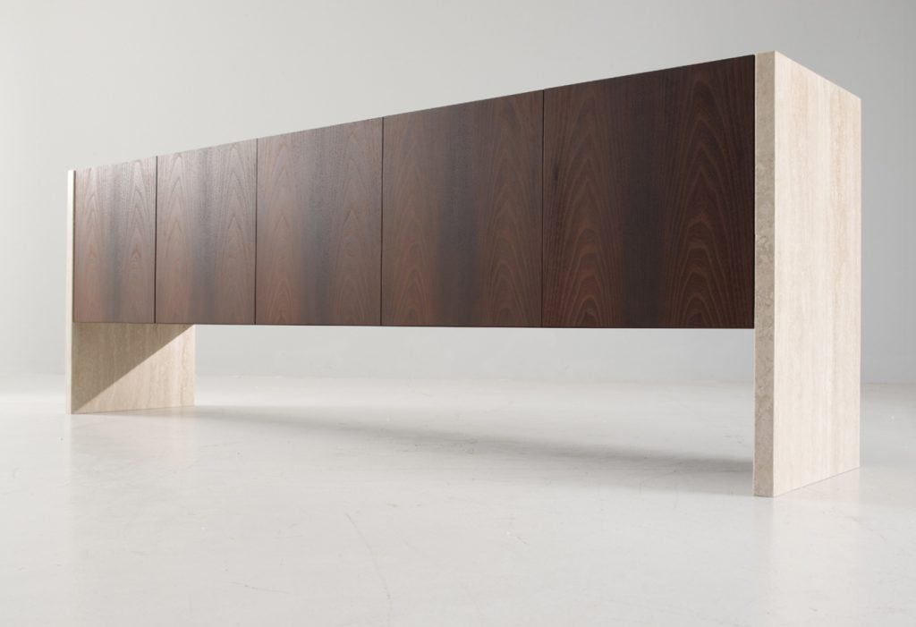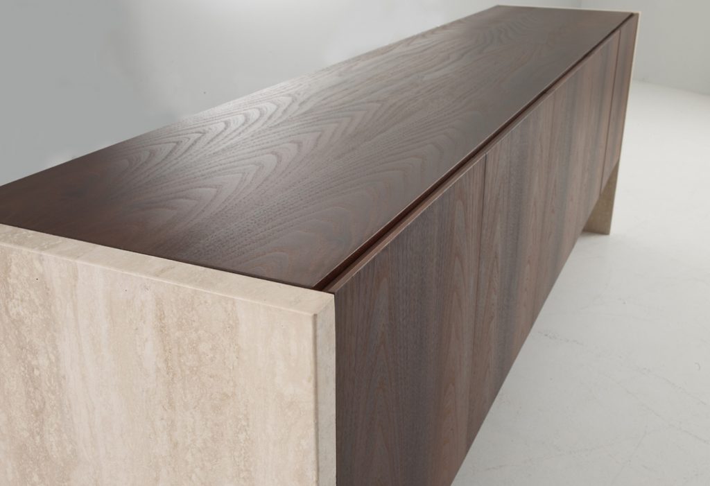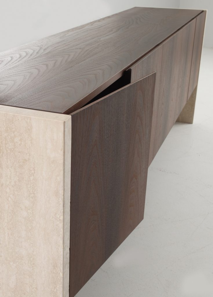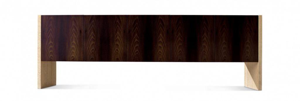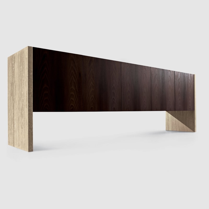 Series of storage units made of veneered panels, characterized by the effect of being suspended between the sides, in marble or in the same veneer of the structure. Available versions with doors, with drawers or with doors and drawers. Single inner spaces equipped with an extra-white tempered glass shelf each.