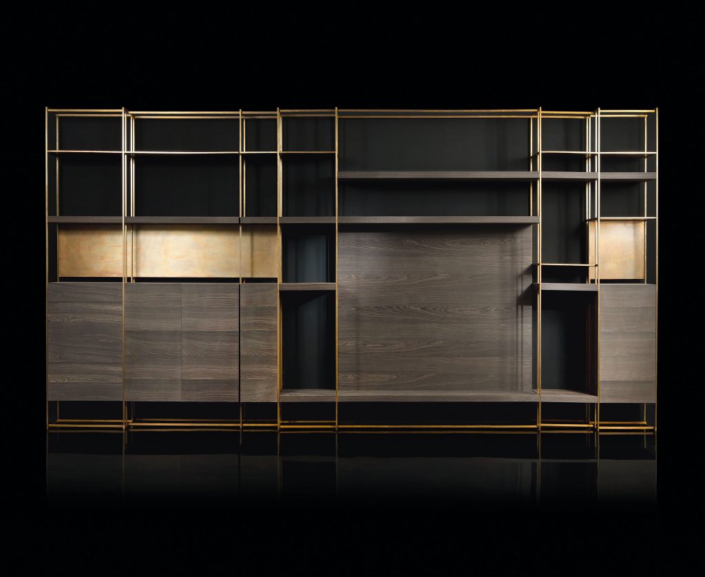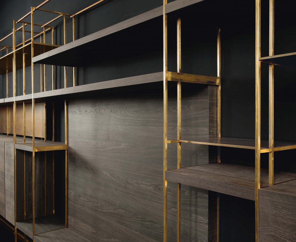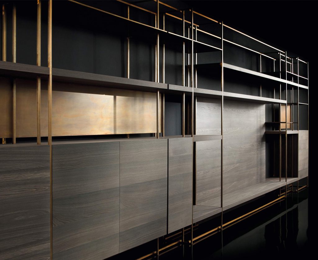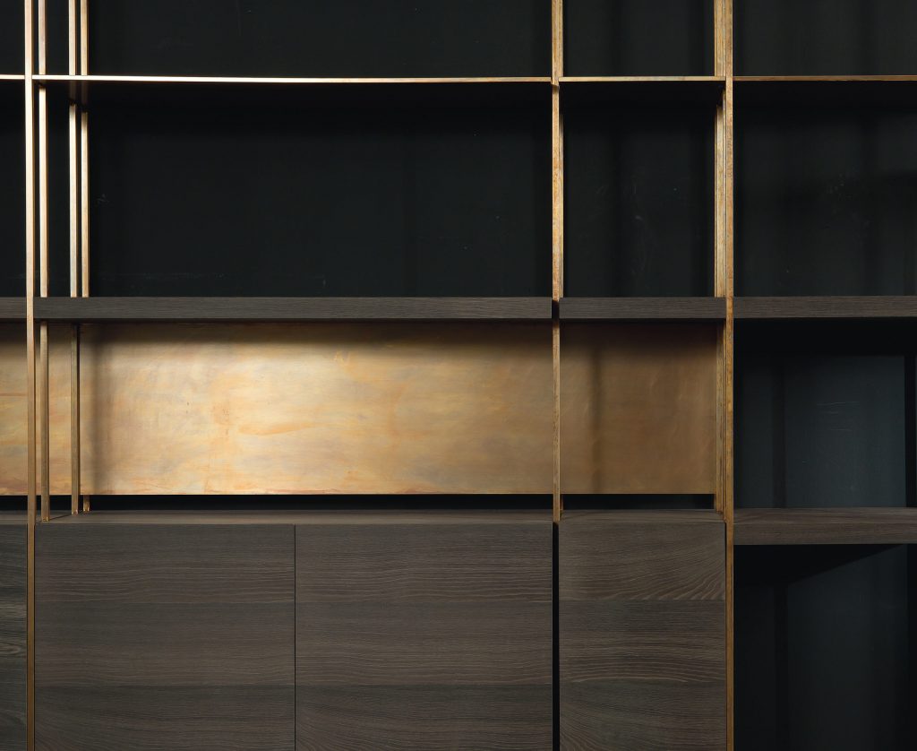 Shelves version with drawer solidwood veneer heat treated woods as our samples and swamp oak, swamp elm oil finish based on natural wax and water. Optional finish: burnished brass, black burnished brass, black burnished steel, burnished titano or burnished platino by hand using traditional techniques. Glass shelves in stopsol glass 1,1 cm thick