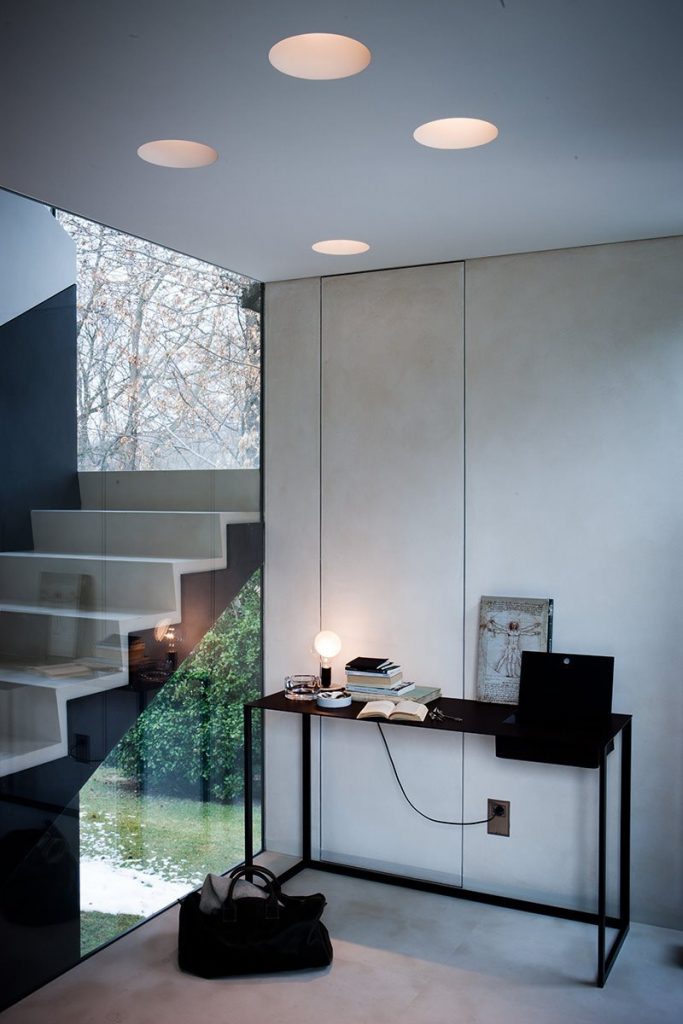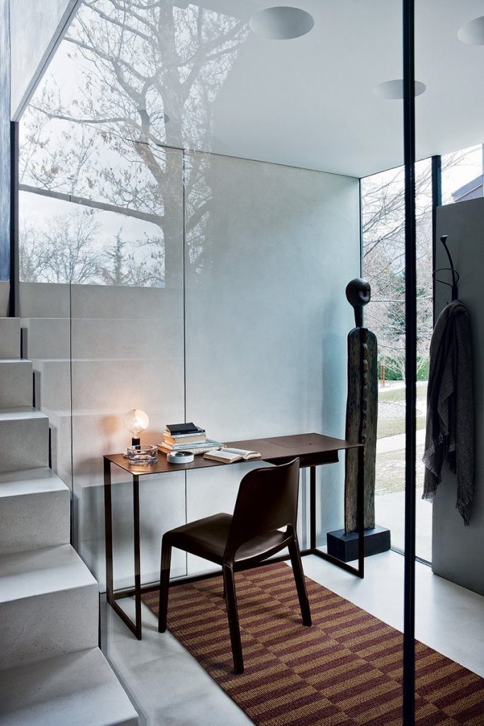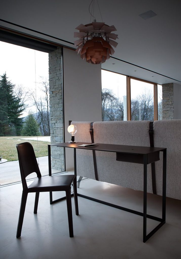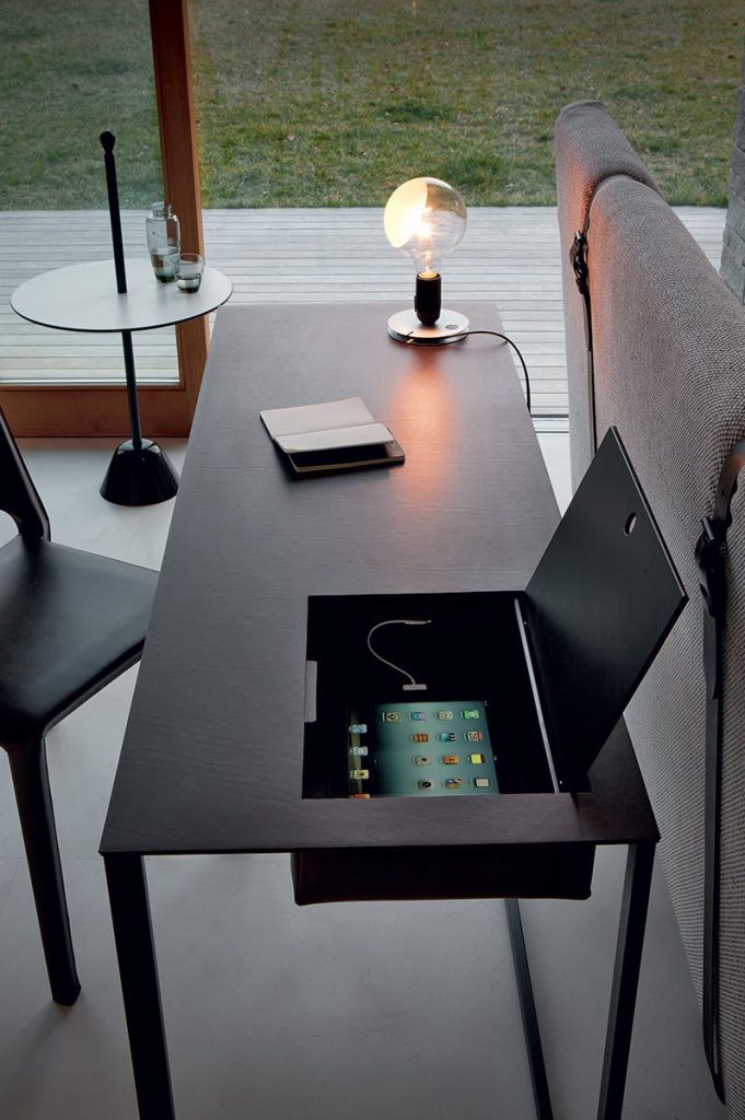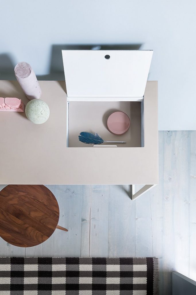 Varnished steel frame and top in black, white or graphite. Top and storage space in cowhide pigmentato 90. The storage space is accessed by a dropleaf opening.