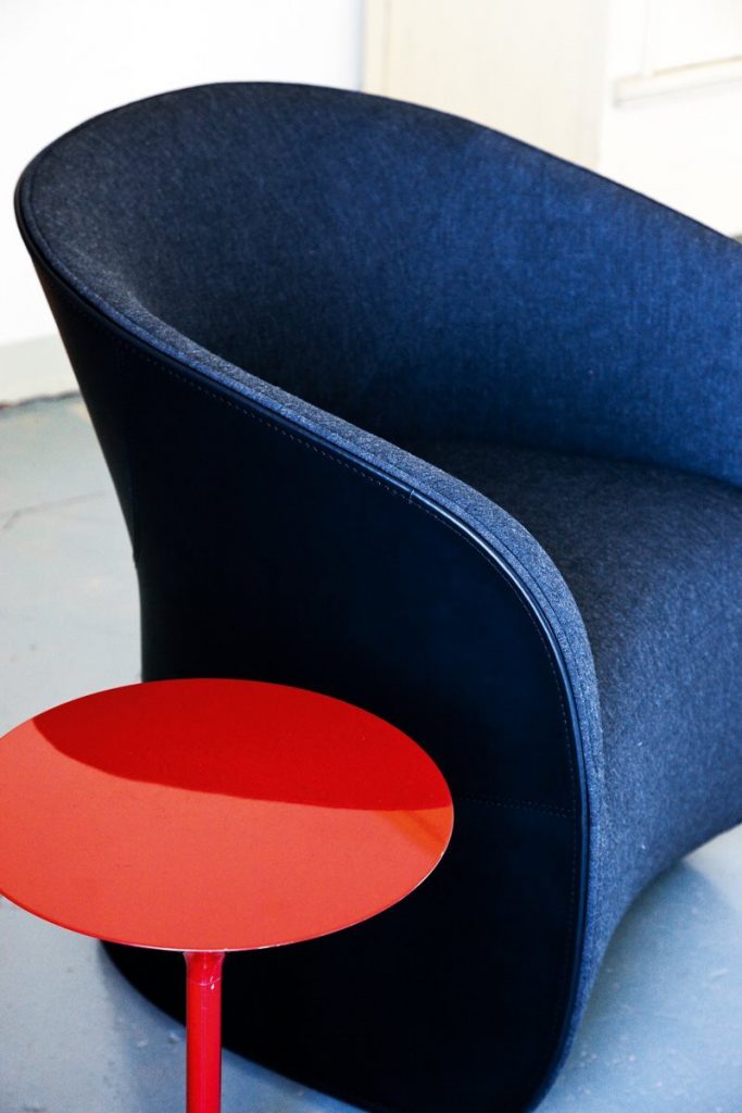 Base on castors or fixed with feet. Steel frame. Upholstery with self-extinguishing polyurethane foam/heat-bound polyester fibre with elastic strips suspension. Removable fabric or leather cover. The external body can even be covered with cowhide 95 combined with fabric or leather. The armchair is available in two different heights above ground level: high 873/A with castors, low 873/B with feet.
