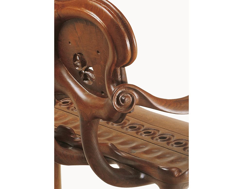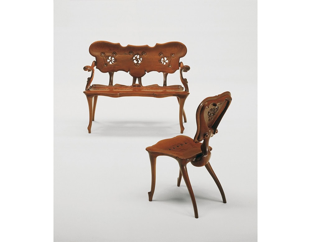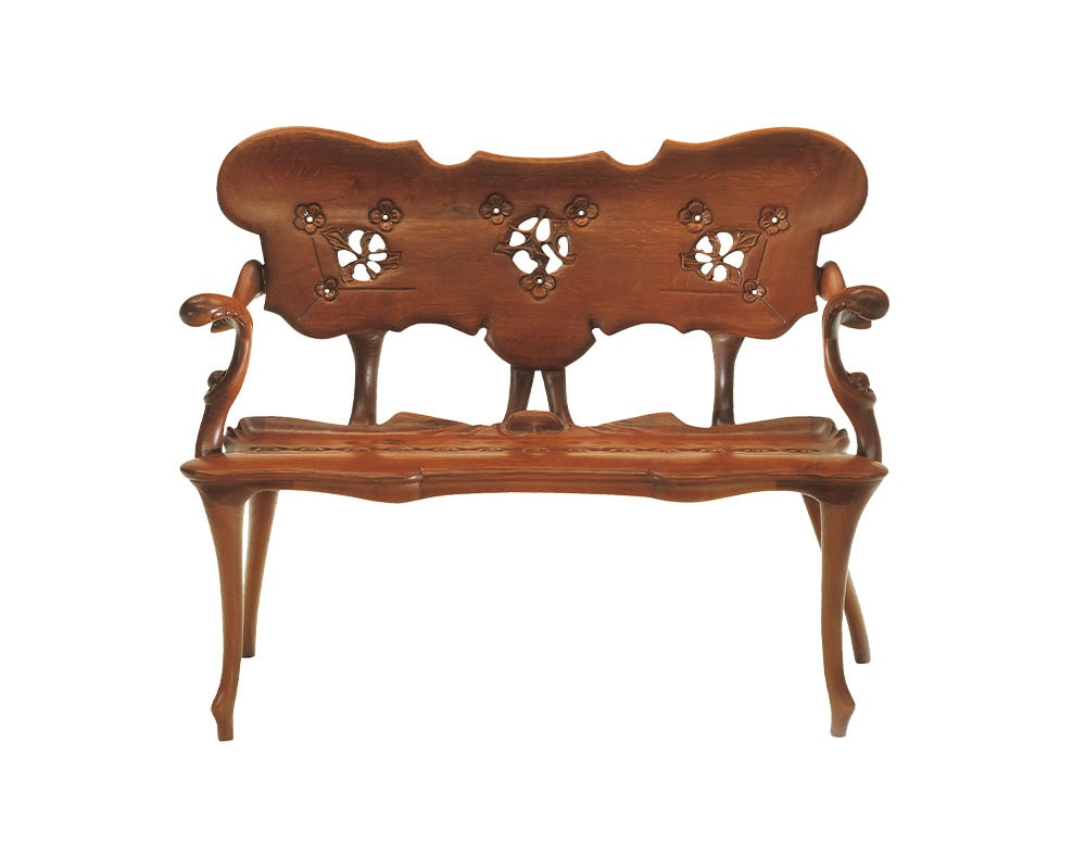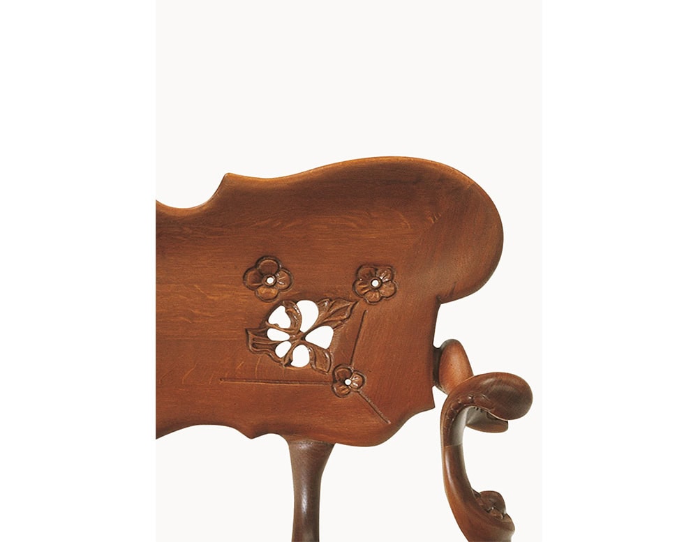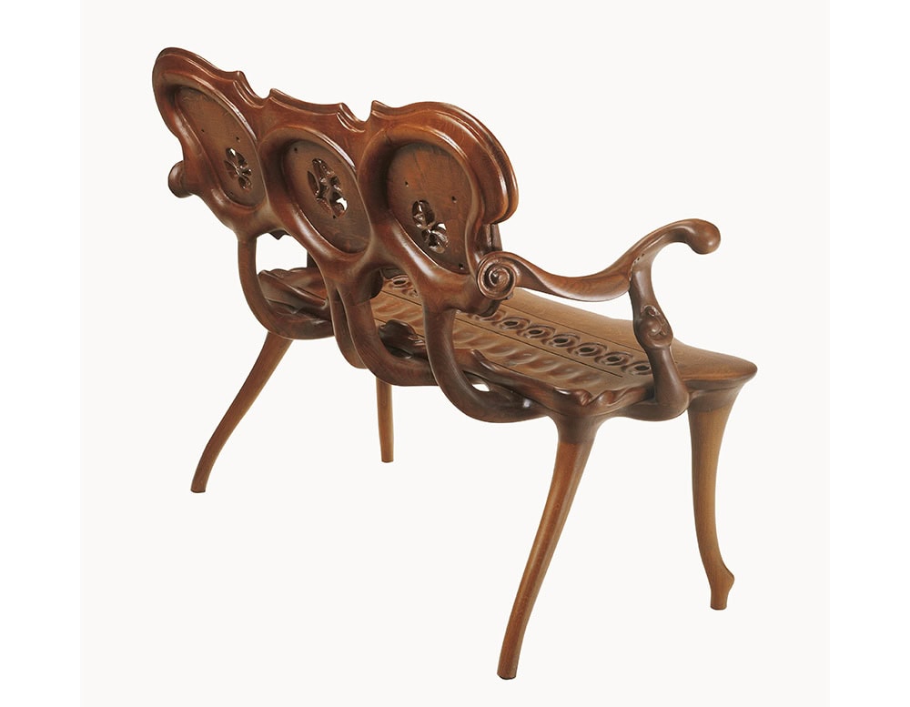 The Calvet Bench merges ornamental carving with creative curves in a varnished oak body. It highlight’s Gaudí’s love for quality and material in a comfortable frame. The bench was designed following his construction of Casa Calvet and was originally located in the Board Room. It is hand-crafted and configured to fit two or three sitters, smoothly spreading an oak bench across four supporting and tapered legs. A fluid frame holds the backrest to the seat and curving into swirling armrests. Gaudí’s ornamental carvings horizontally spread three floral motifs. They create a symmetry, aligning the proportions of the bench and emphasising the lightness and slender dimensions of the bench.