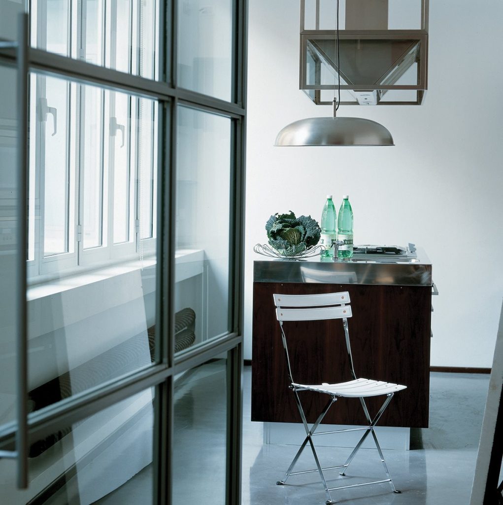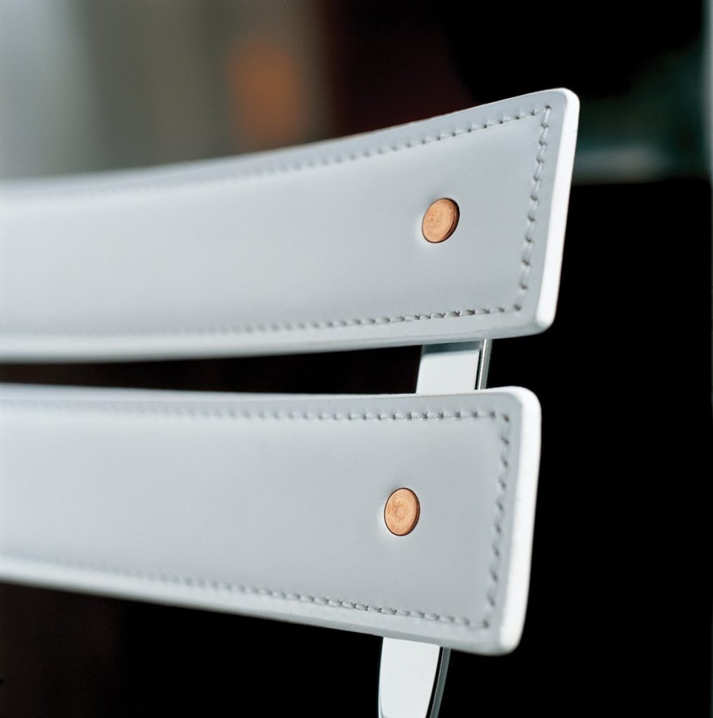 Frame in black or white painted steel. Nylon seat and back covered in cowhide 95.