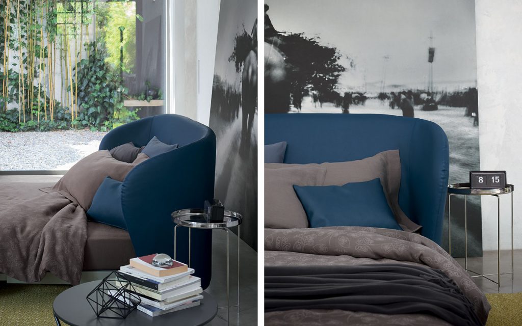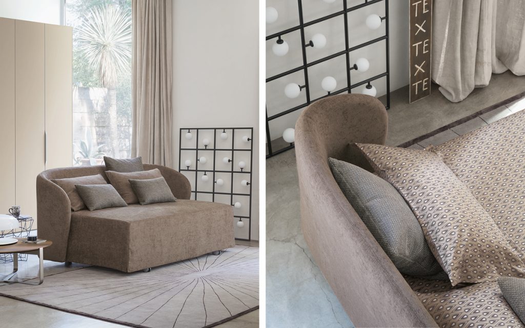 Celine, roomy, deep and cozy, is an armchair-chaise longue that can be rapidly transformed into a comfortable single bed (mattress size 90x200 cm.) or a large sofa that can be rapidly transformed into a double bed (mattress size 160x200 cm.). Both versions are available with a completely removable cover in fabric or Ecopelle. The cover can be in one color or in a choice of two colors of the same fabric: one for the external cover of the backrest and the sides of the seat cover, the other for the internal part of the backrest and the upper part of the seat cover. Both versions can be fitted with a Memoform or Special mattress that folds and unfolds on the pull - out fixed slats frame fitted with wheels when you need to transform the armchair into a single bed and the small sofa into a double bed.