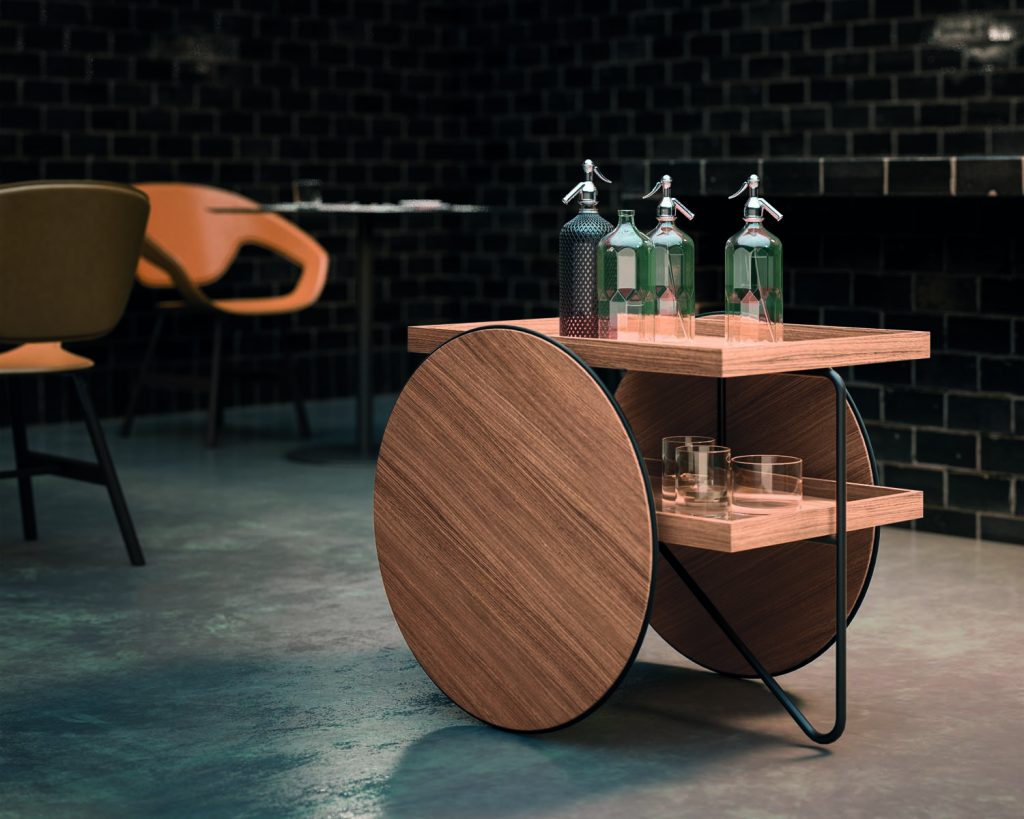 Chariot is a mobile table consisting of three simple elements joined together: wheels, trays and structure. The wheels, which in common carts are usually small, are brought to the extreme size, becoming the iconic element of the project. The rubber profile is inserted into the wheels for easy movement; the two trays act as storage compartments, the metal structure is also a handle: slightly raising the cart, it can be moved.