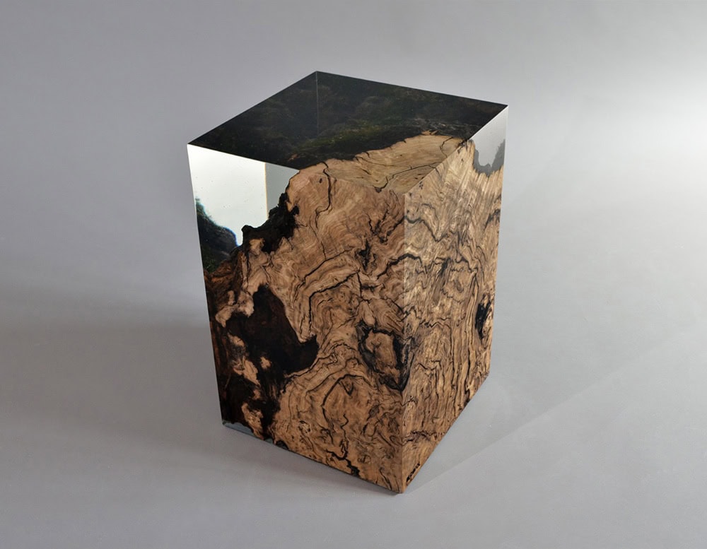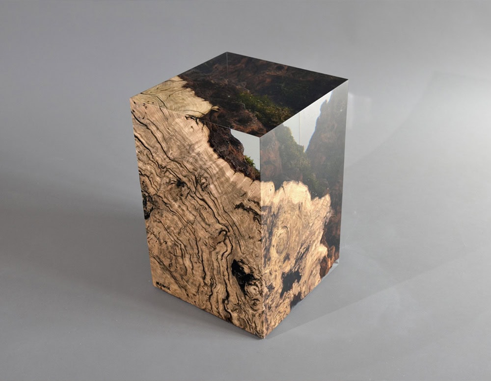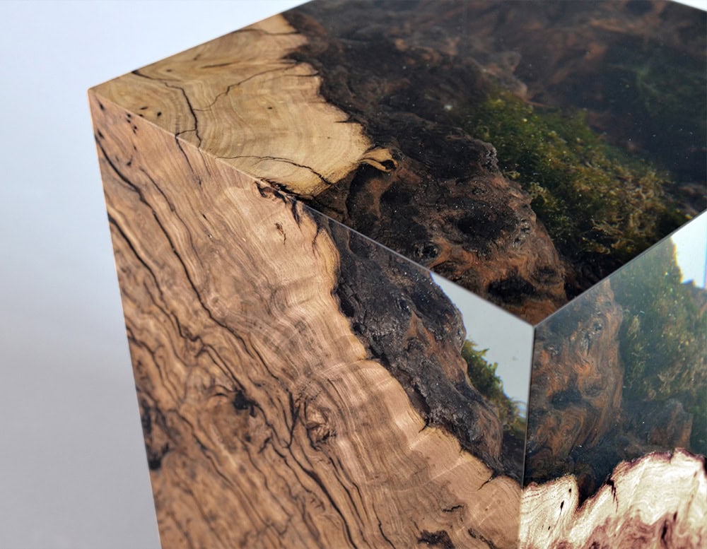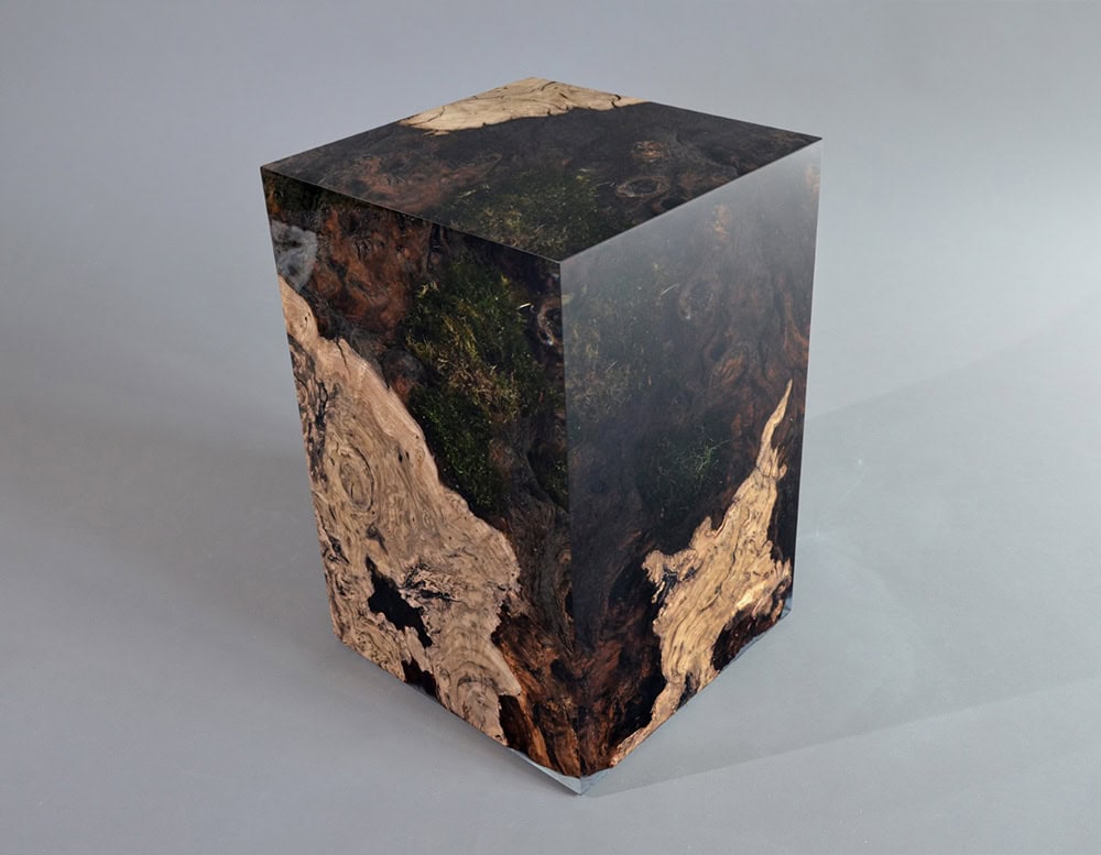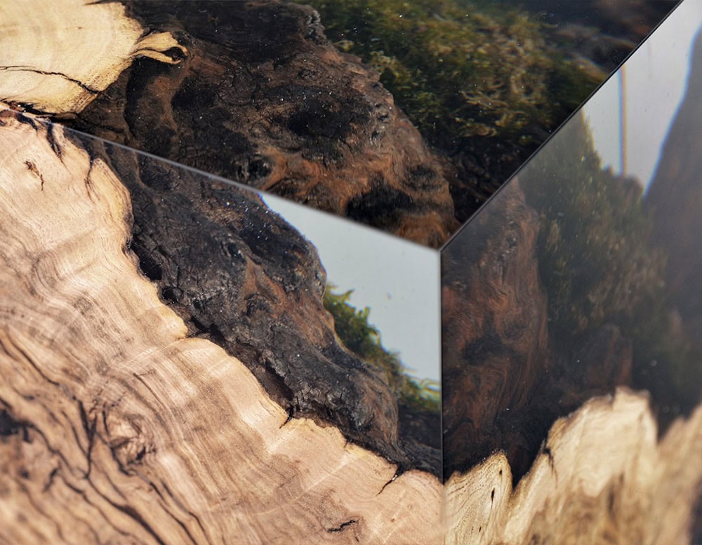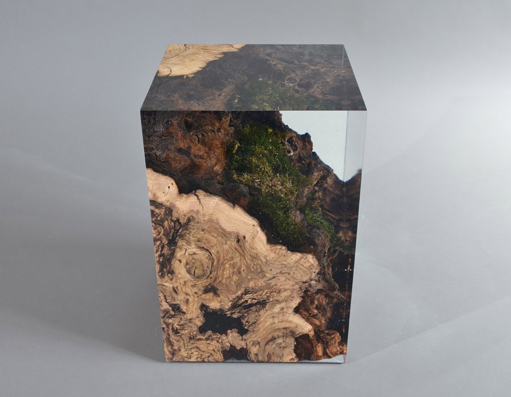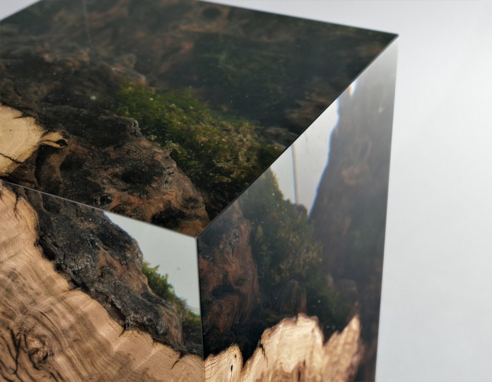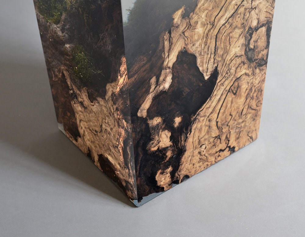 alcarol recover discarded pieces of Burled Chestnut log from a wetland of the Italian Dolomite countryside and preserve the natural bark surface with its native populations of plants, which are embedded in a transparent resin resembling the habitat water that generated their life.
