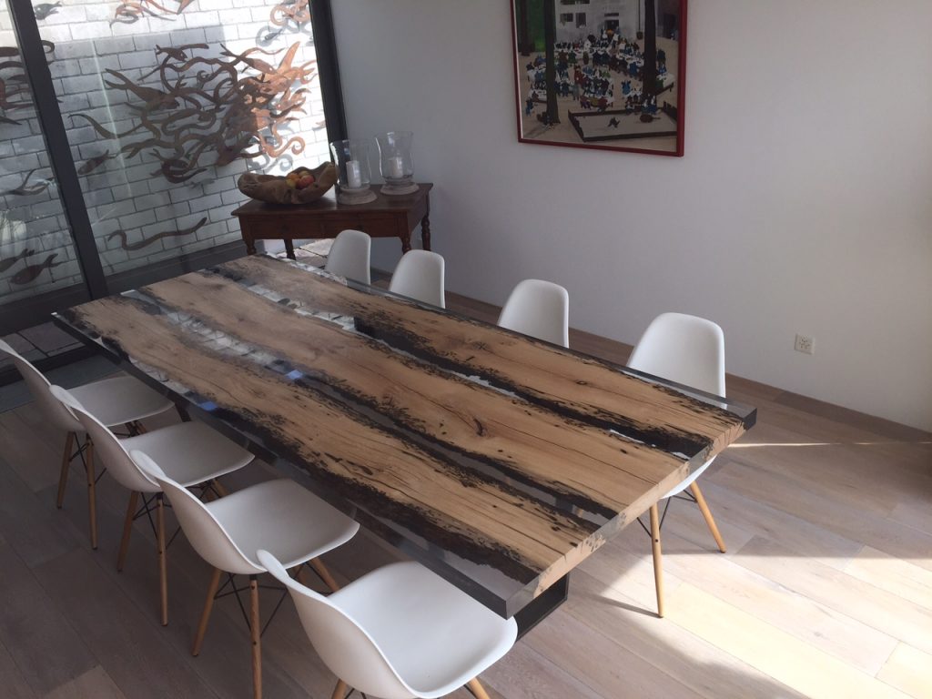Chimenti _ Table is made of three solid OAK WOOD planks obtained from the Venetian Briccole poles, preserved in EXTRACLEAR RESIN resembling the Lagoon water. The legs are in BURNISHED STEEL.