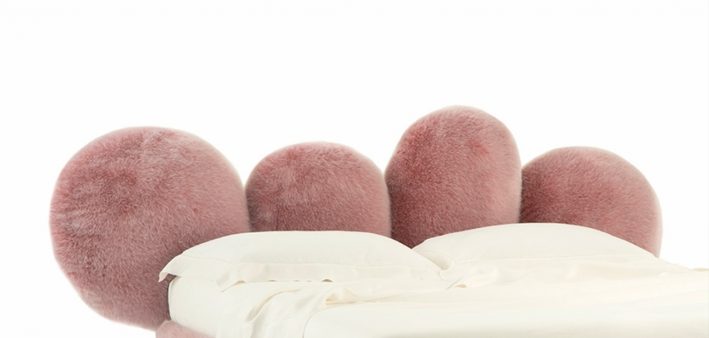 Padded bed made of four soft and structural pillows, reminding us of powder puffs, attached to an invisible structure in metal tubular.