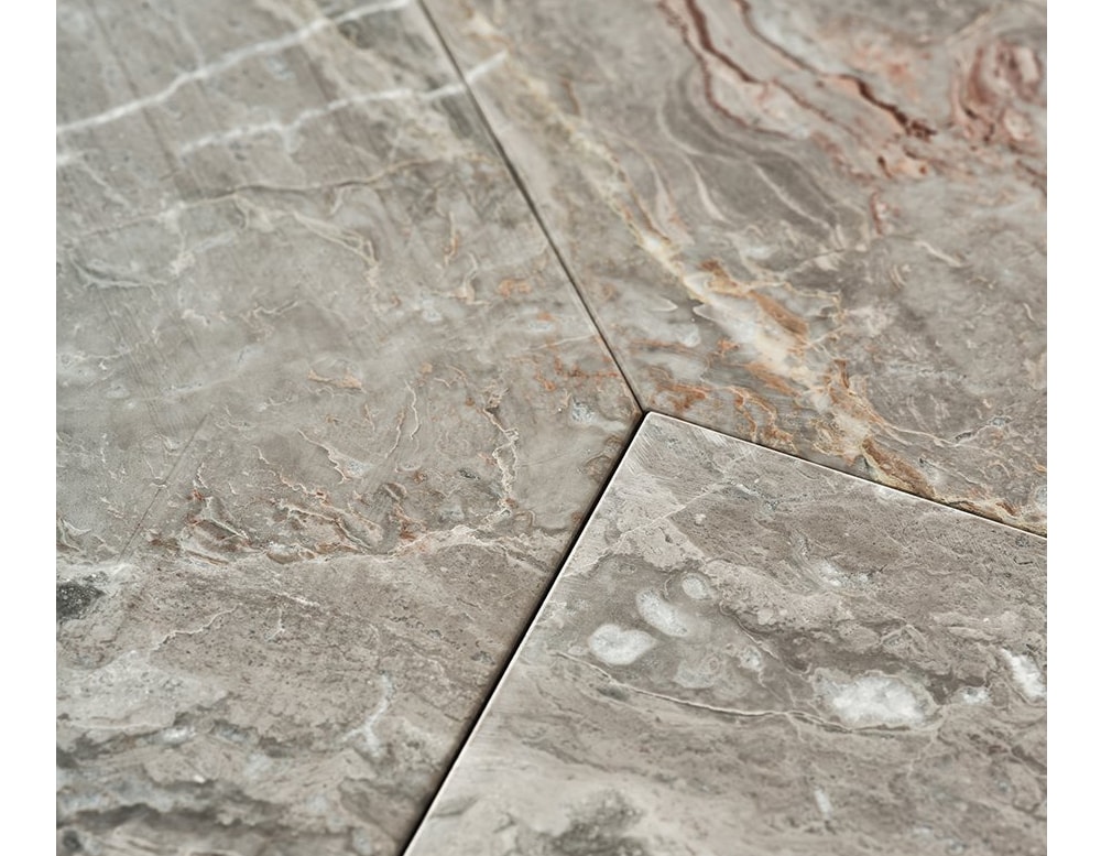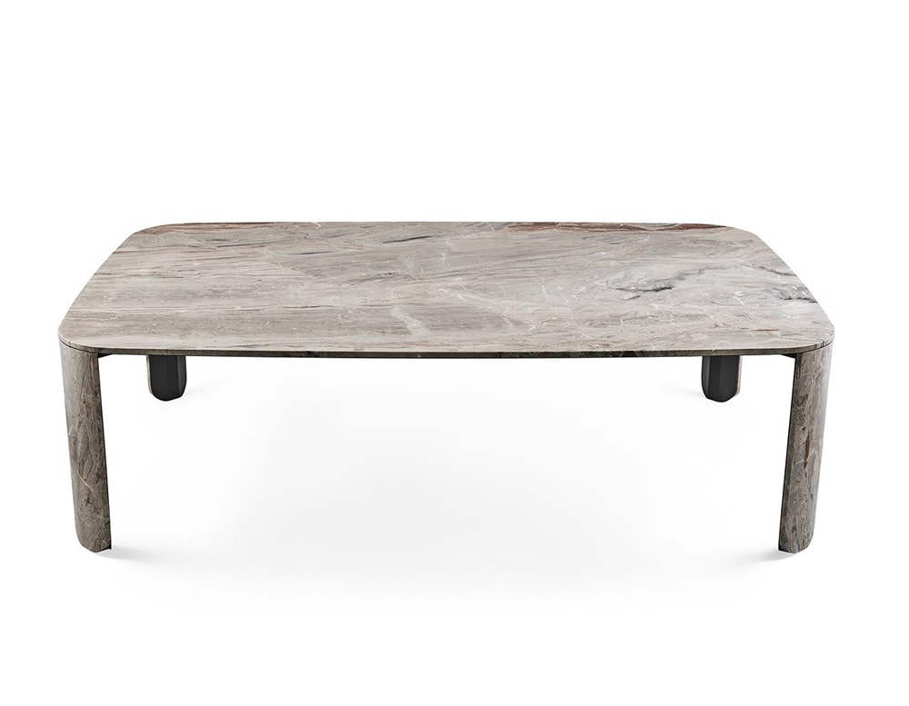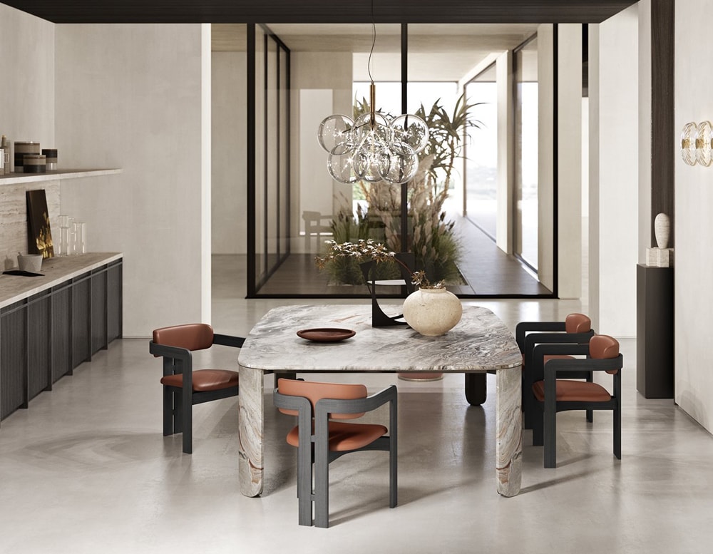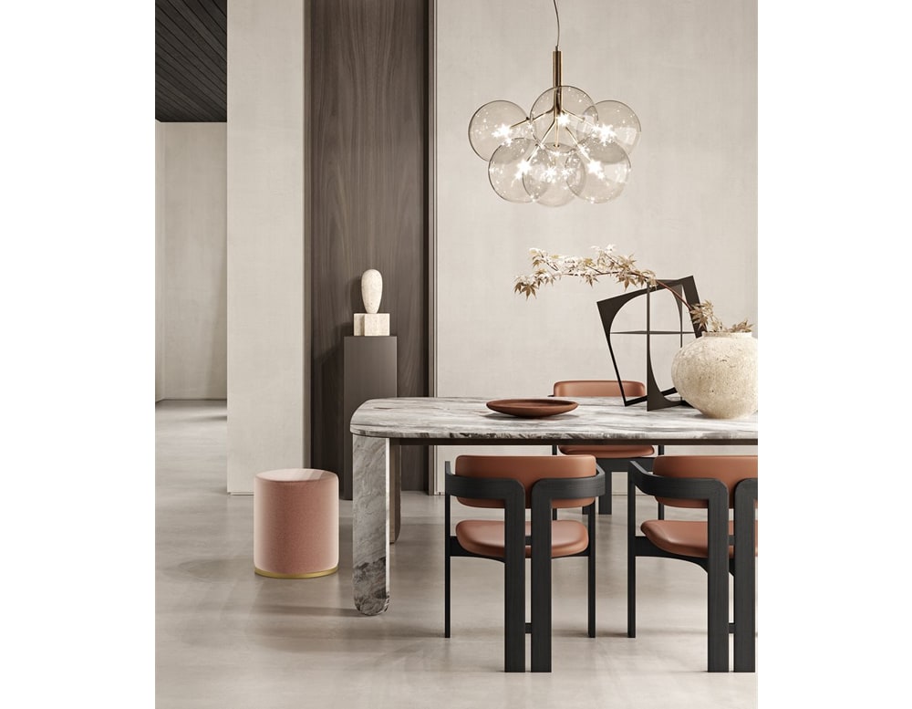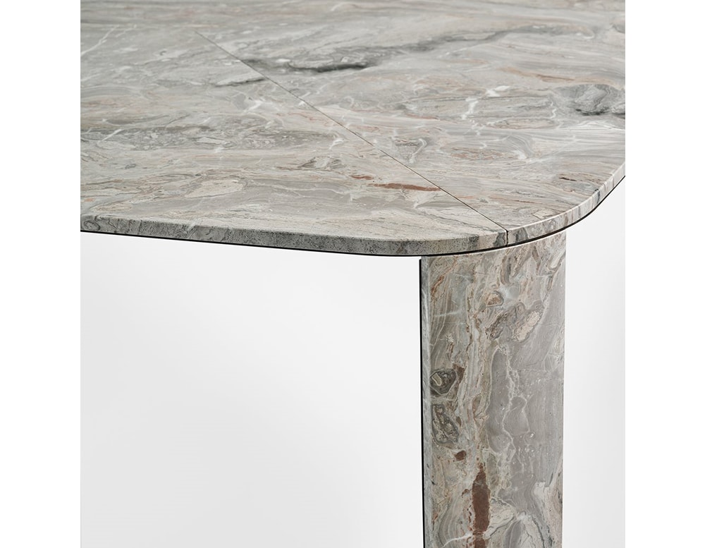 Table in 20mm Arabescato Orobico Rosso satin marble. Also available in brushed Ceppo di Gré® or brushed Bianco Carrara Gioia marble. “Dark” hand burnished metal details.