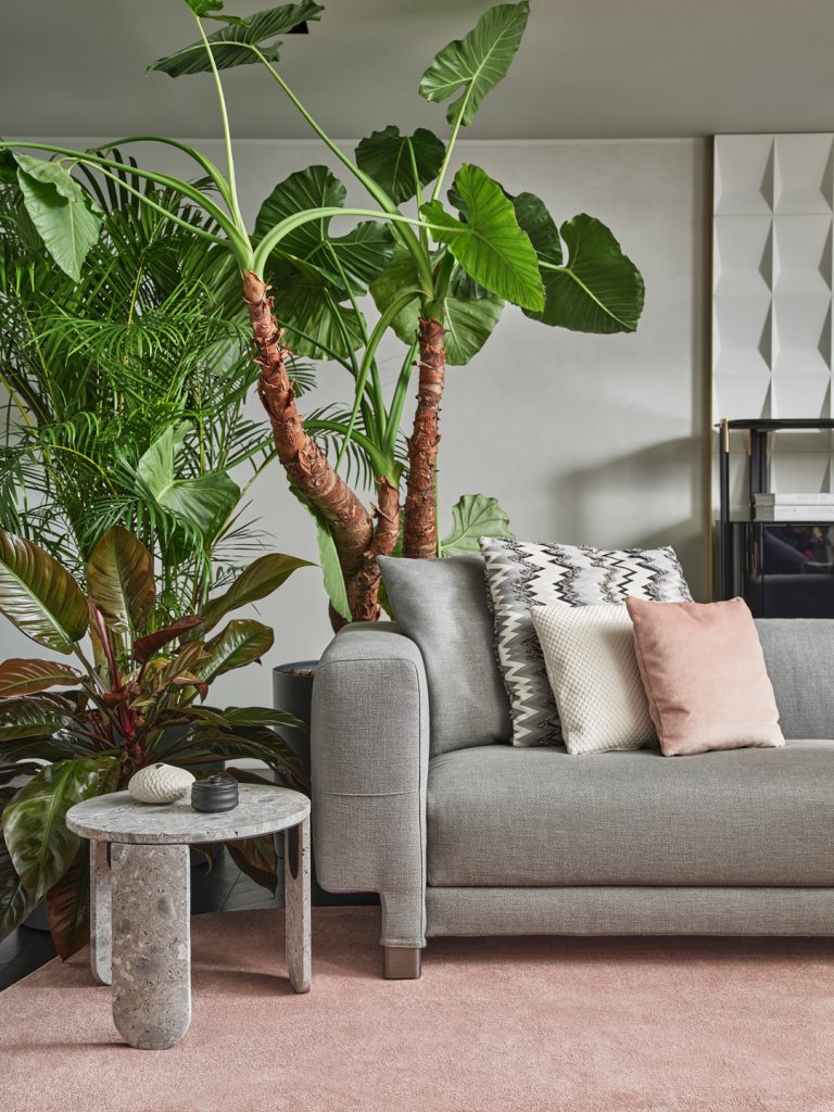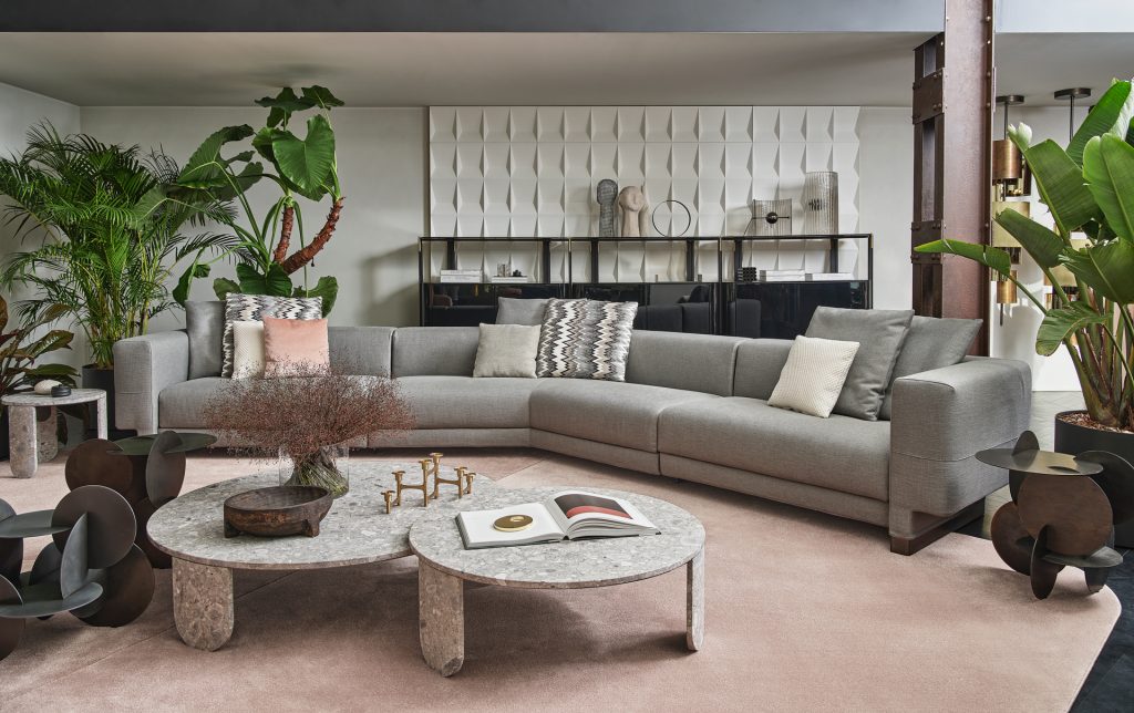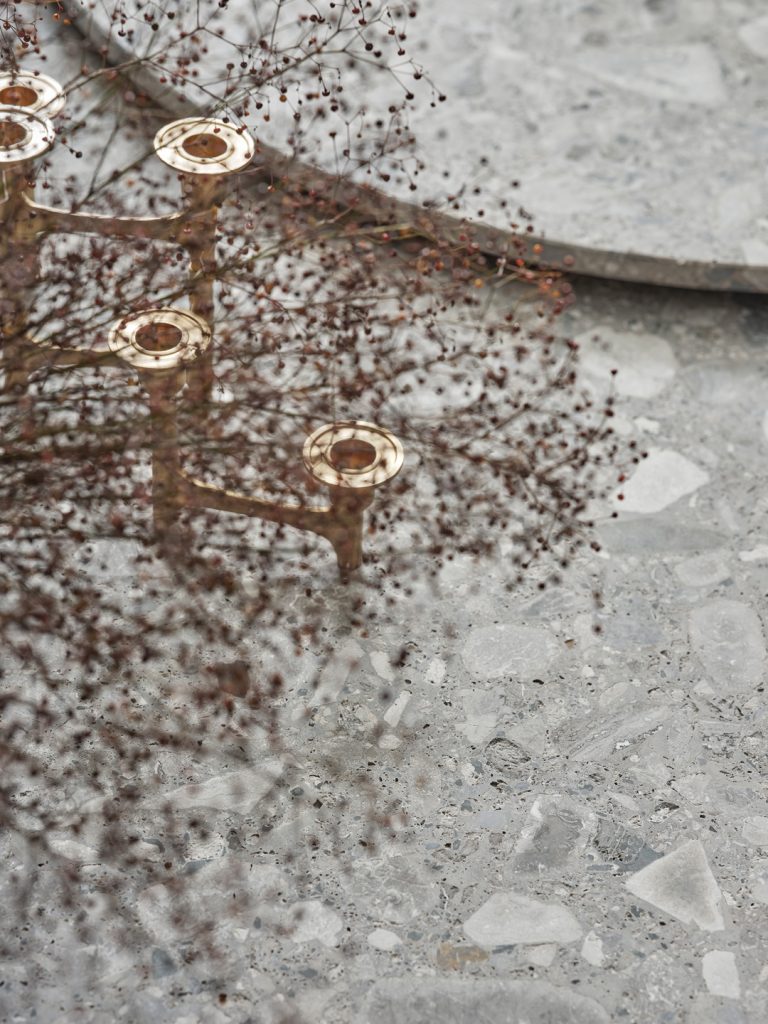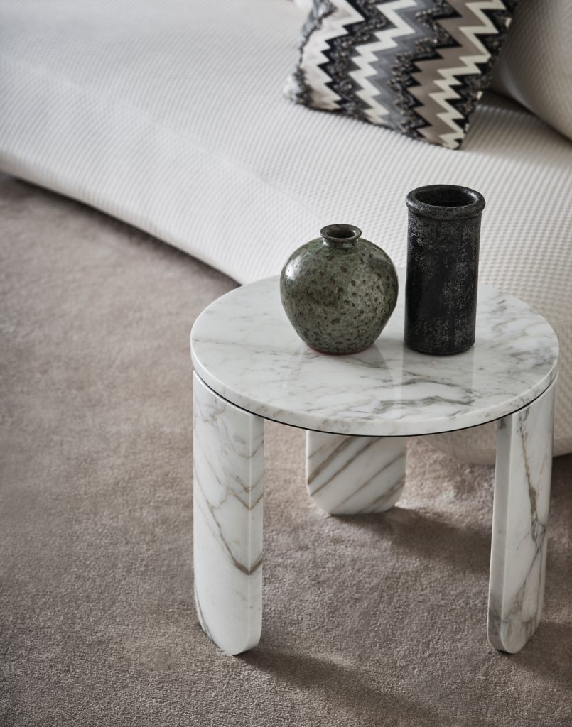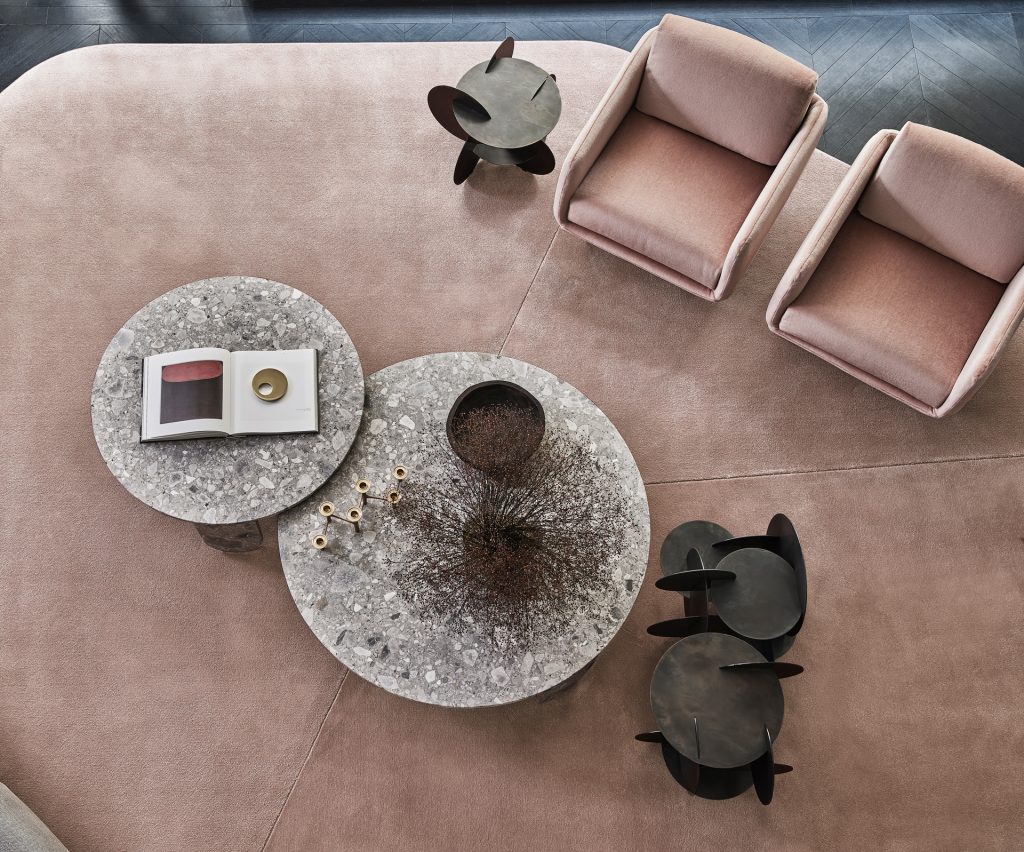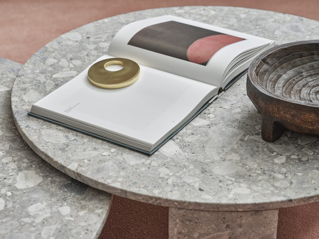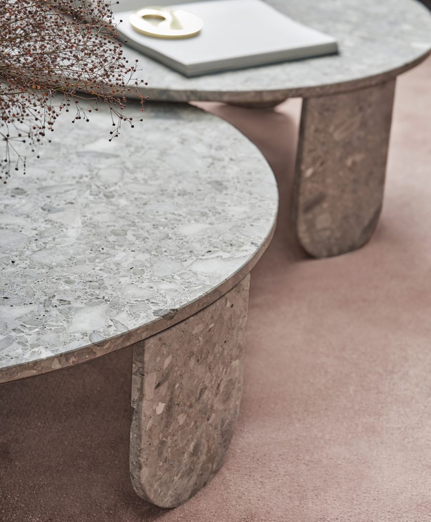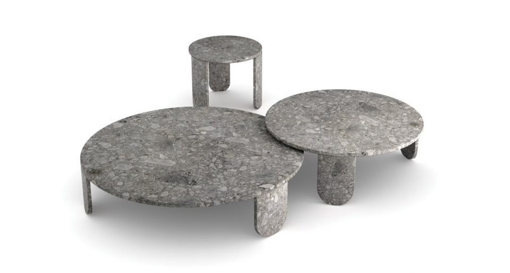 Coffee table in brushed Ceppo di Grè with hand burnished metal details. Also available in natural polished Calacatta Vagli Oro marble, Bianco Carrara marble or Fior di Pesco brushed marble.