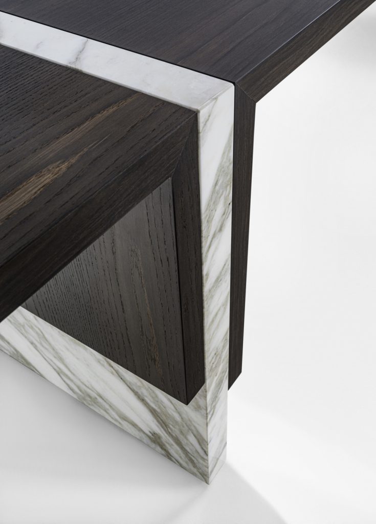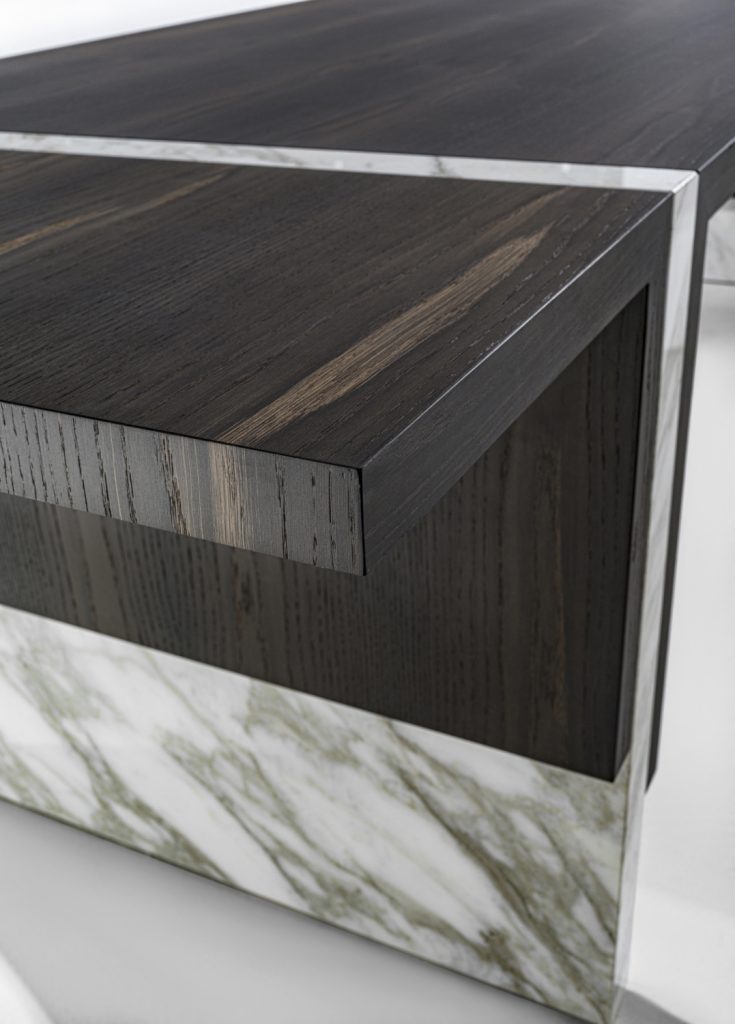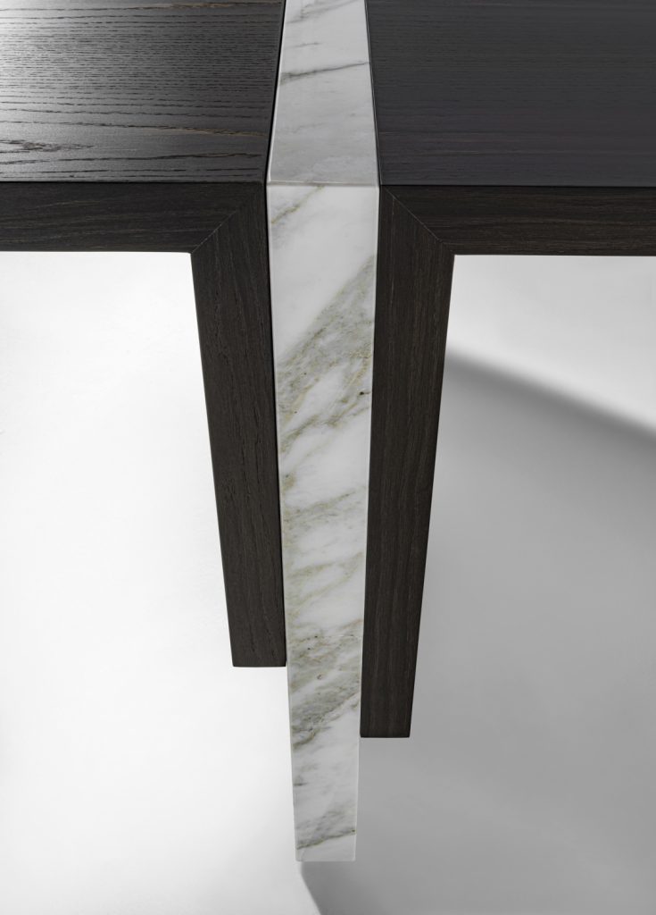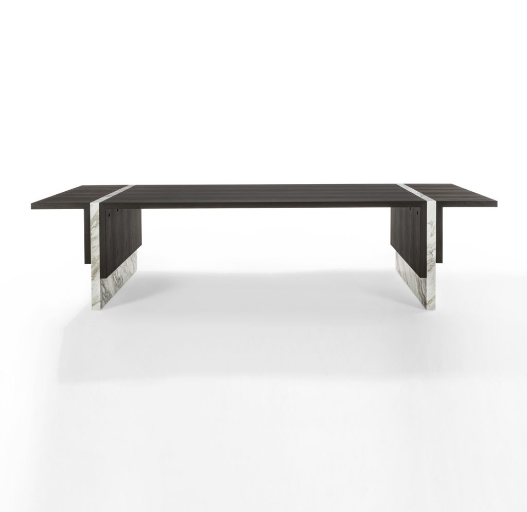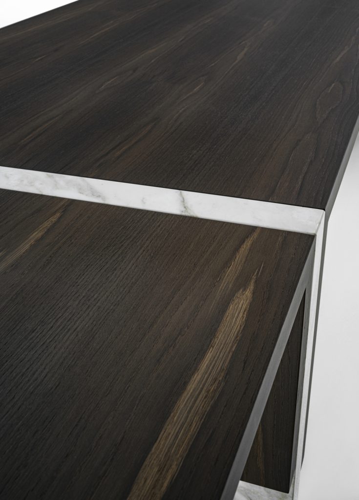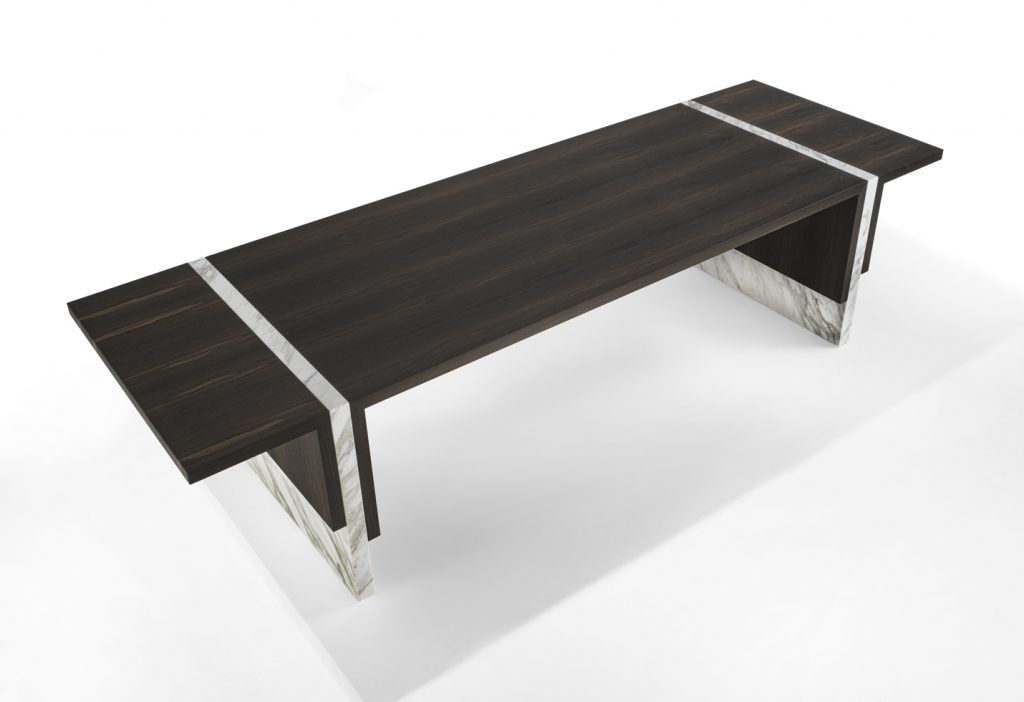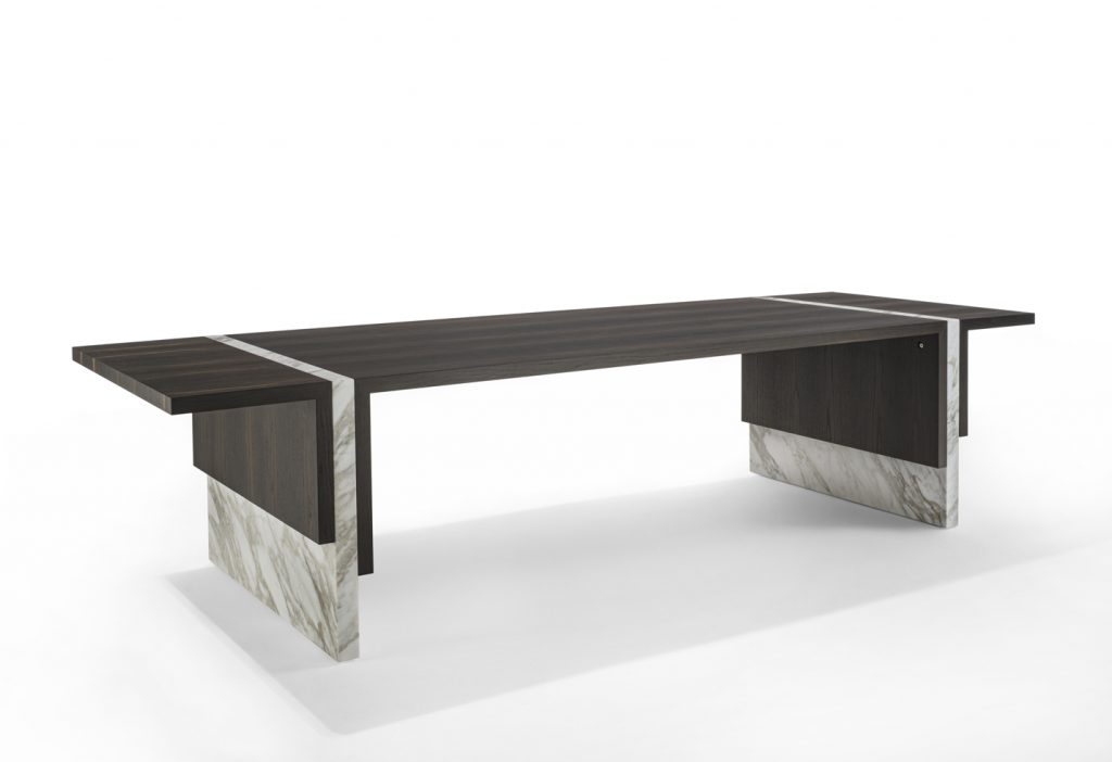 Table of great formal simplicity, featuring the combination of flat elements juxtaposed together in different measurements and thicknesses. These latter are made of veneered multilayer wood and marble.