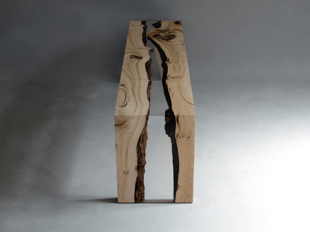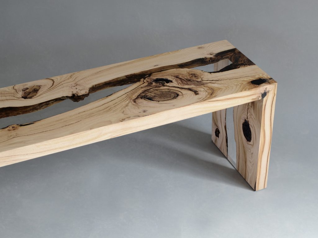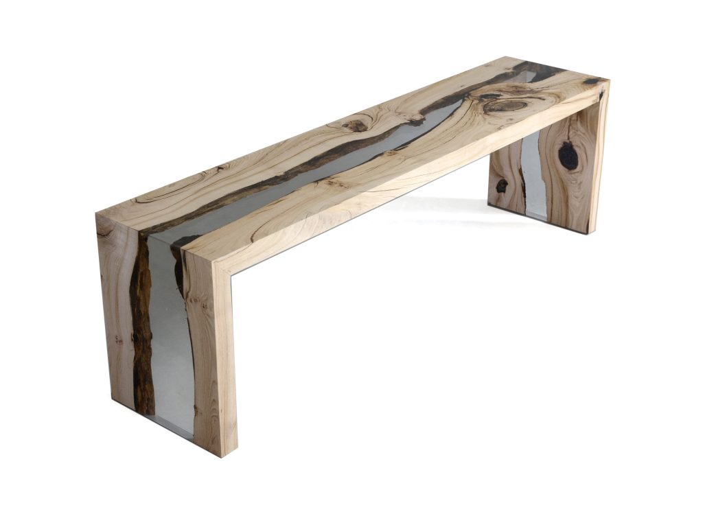 The Creek Bench combines natural wood with clear resin, creating a flowing river-like effect. Its minimalist form highlights organic textures, making it both functional and sculptural.