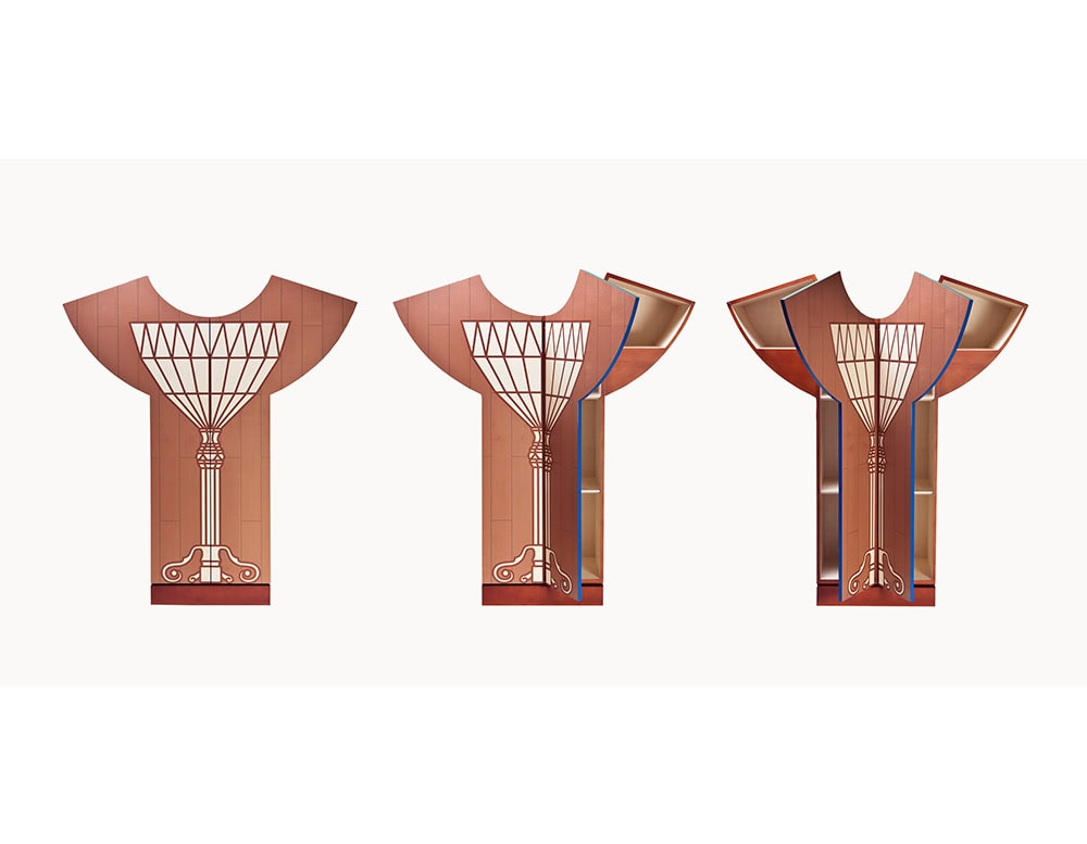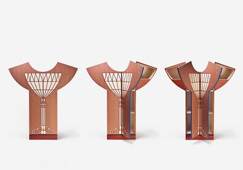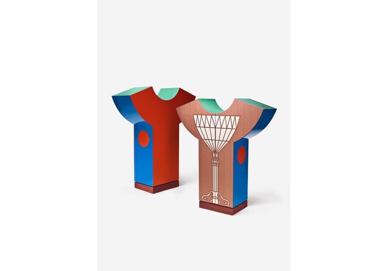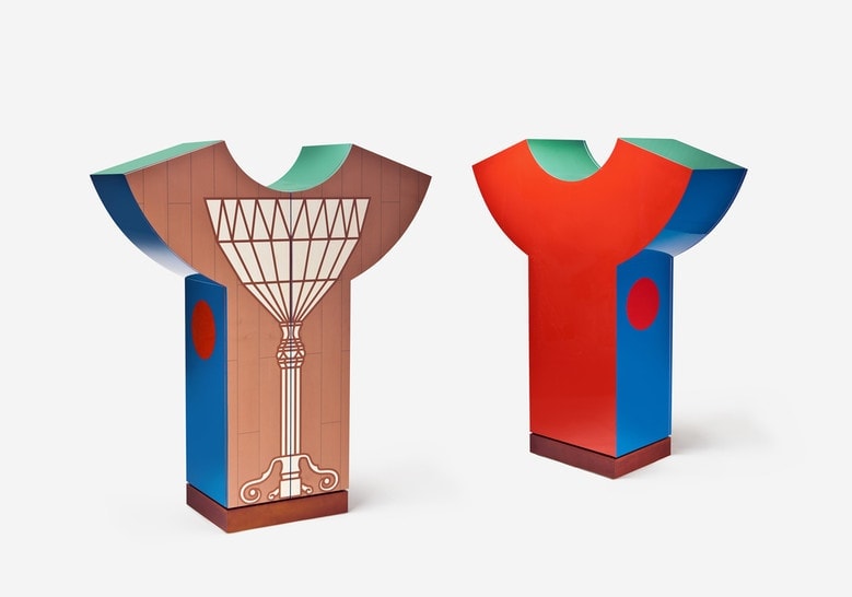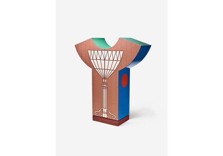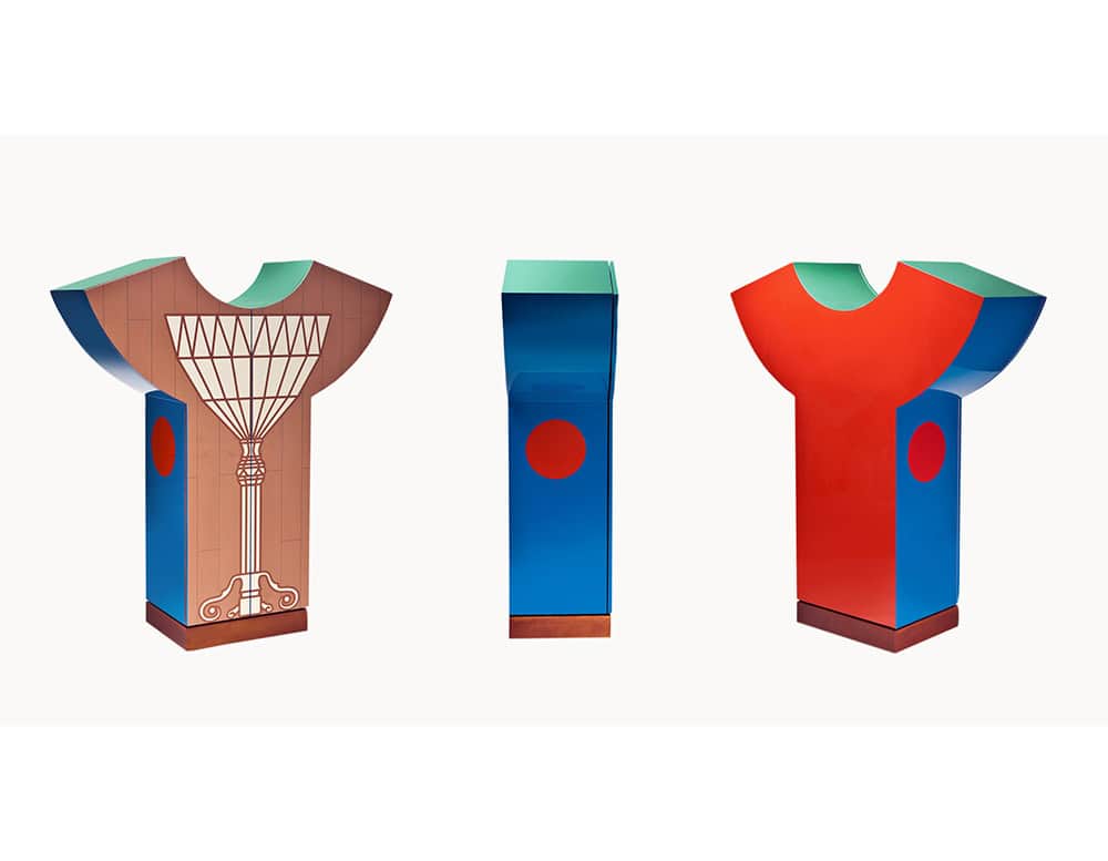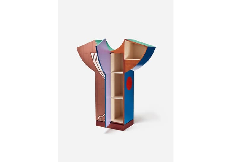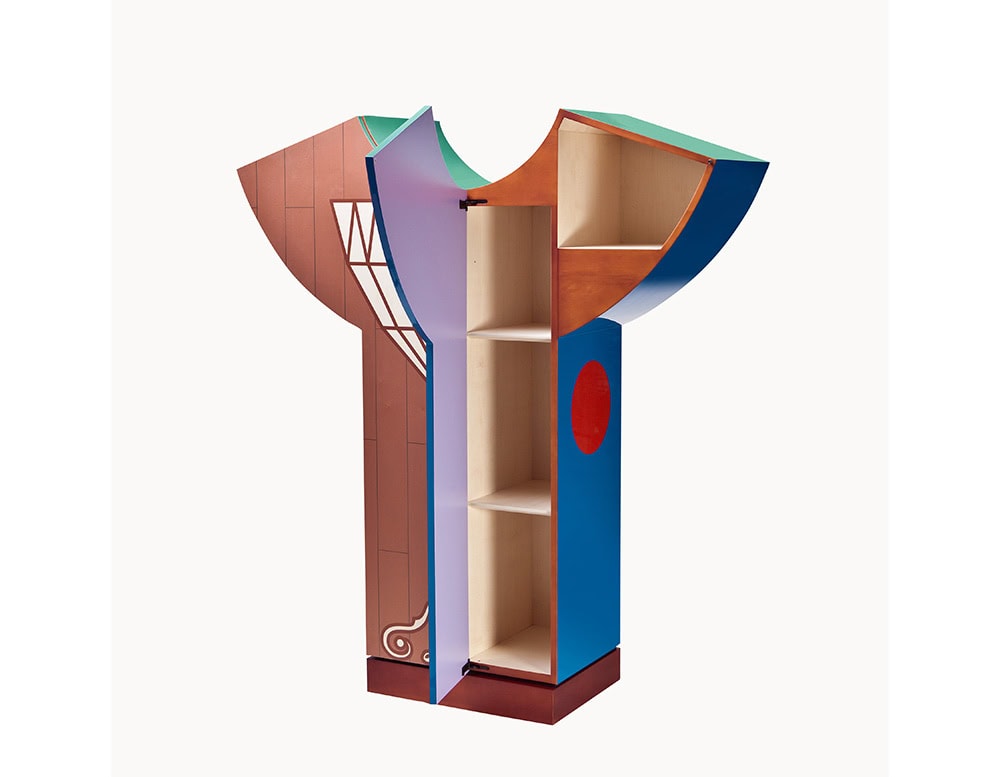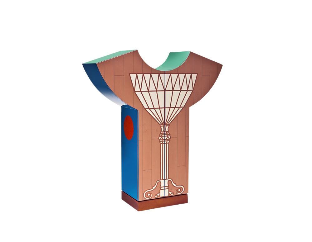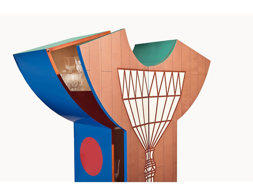 This is a sculpture, cabinet and beautiful design from the great Alessandro Medini. Mendini was a radical designer who influenced architecture and design in Italy and on a global scale, bringing colour and exciting forms into buildings such as the Groninger Museum in The Netherlands and the iconic Proust armchair, which blended a baroque form with multicoloured hand-painted pointillist dots. BD was inspired by his concept of the “neoartesanado postindustrial” (new post-industrial crafted art) and worked alongside him in the 80s. His last design, the Cristallo, was for BD. The freestanding piece has a veneered sycamore wood finish in its interior, fitted with shelving in its compartments. The exterior has a glossy finish and is multicoloured, with a graphic print of a white trophy forming the facade of the piece. The form stretches from its sturdy base into two outstretched arms, rising like a trophy.