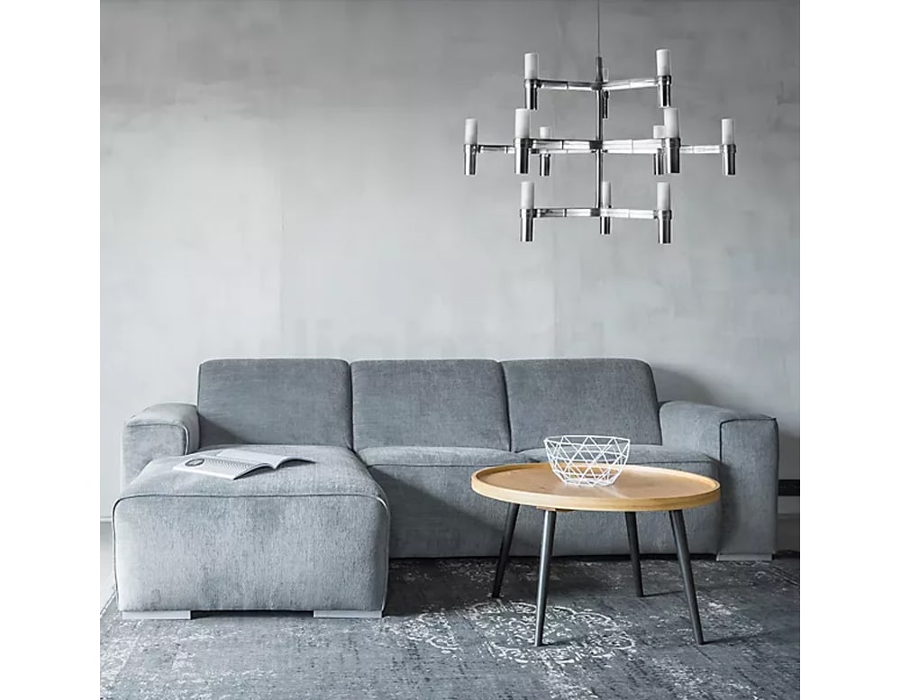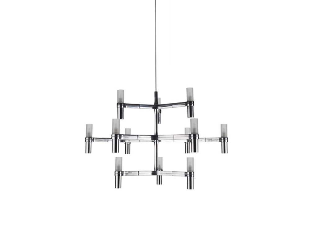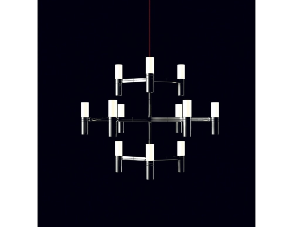 Pendant chandelier whose shape is inspired by the outline of the snow crystal. Modular lamps with a die-casted aluminum structure and sandblasted glass diffusers. Black painted finish. Equipped with a transparent cable. G9 LED