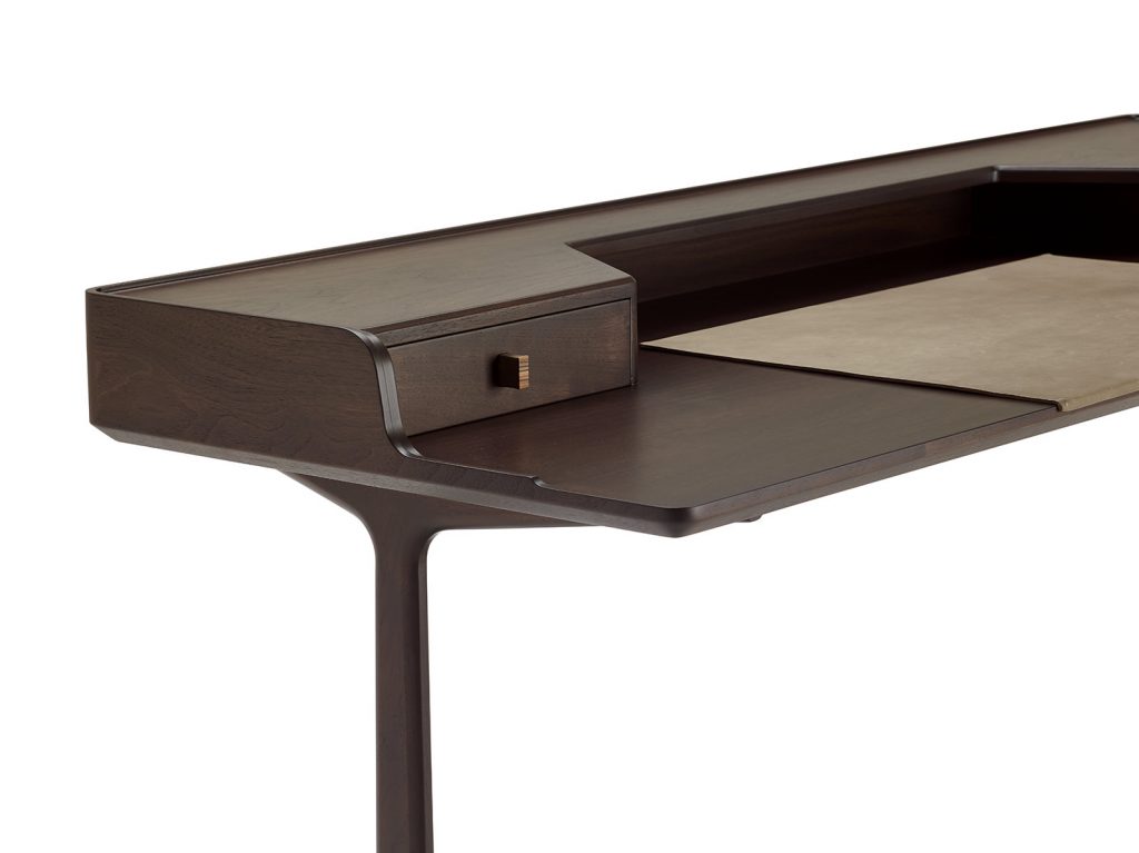 Small desk made in solid american walnut and veneered plywood, wooden top, leg tip in brass, 2 drawers with handles in ebony covered in leather.