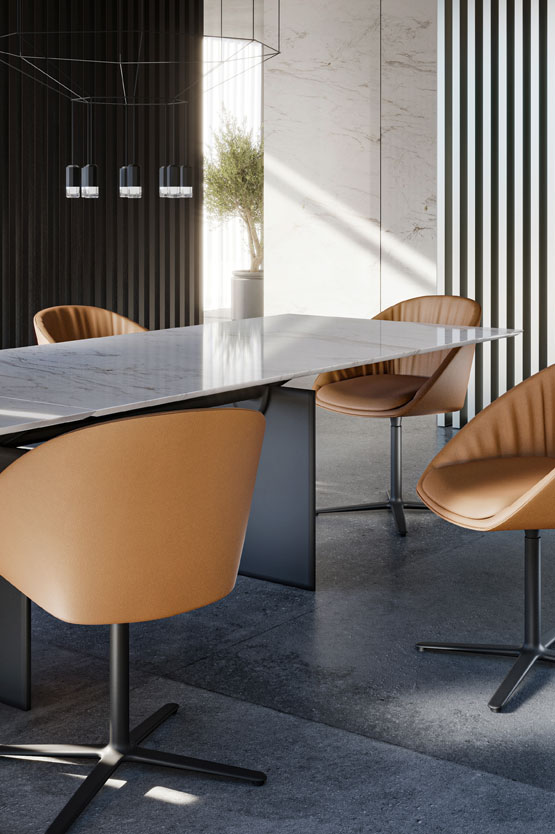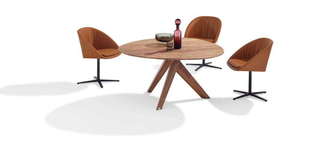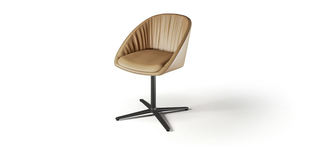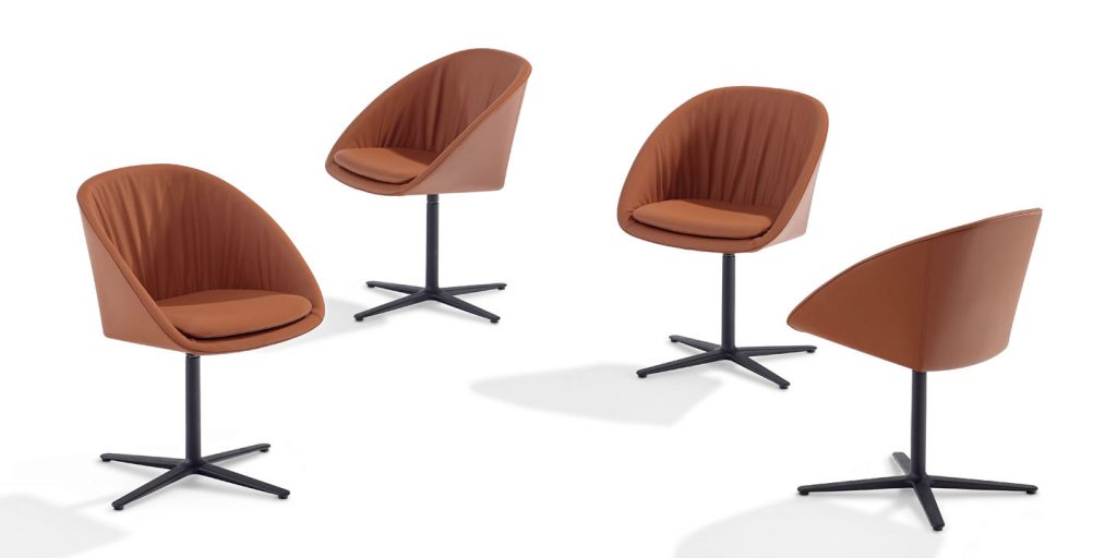 This shell chair leaves nothing to be desired in regard to the seating comfort. The slightly flexible backrest and an additionally inserted seat cushion provide cozy snugness. The casual drapery ensures a relaxed sitting pleasure and formal finesse. DAN is available with 2 different chair frames. The 2042 with tapered steel legs black, dark bronze or gold-color coated, or the 2043 with a swivel seat on a black coated aluminum 4-star base.