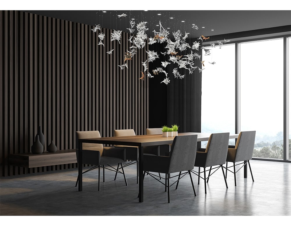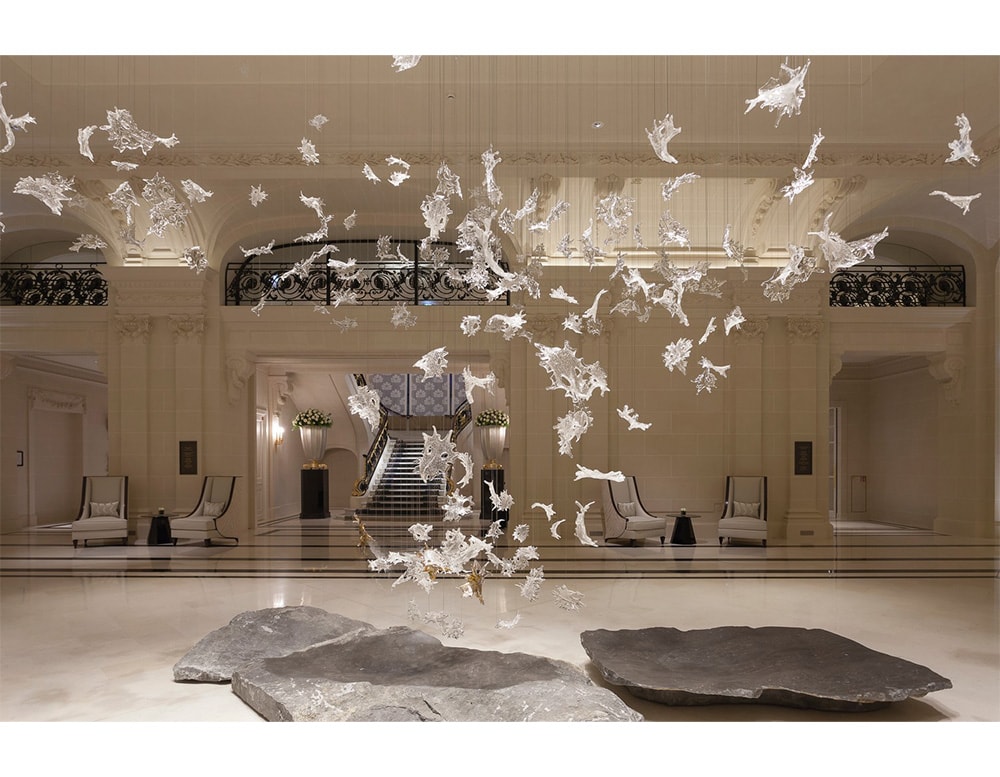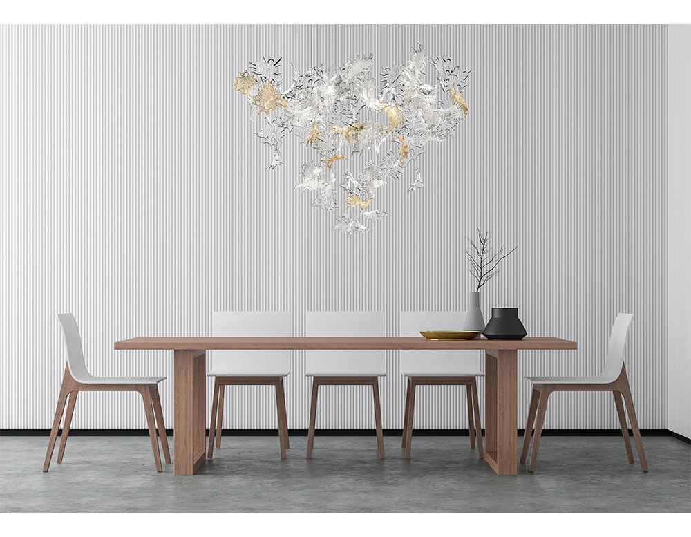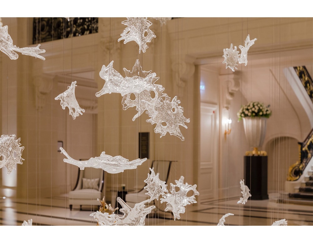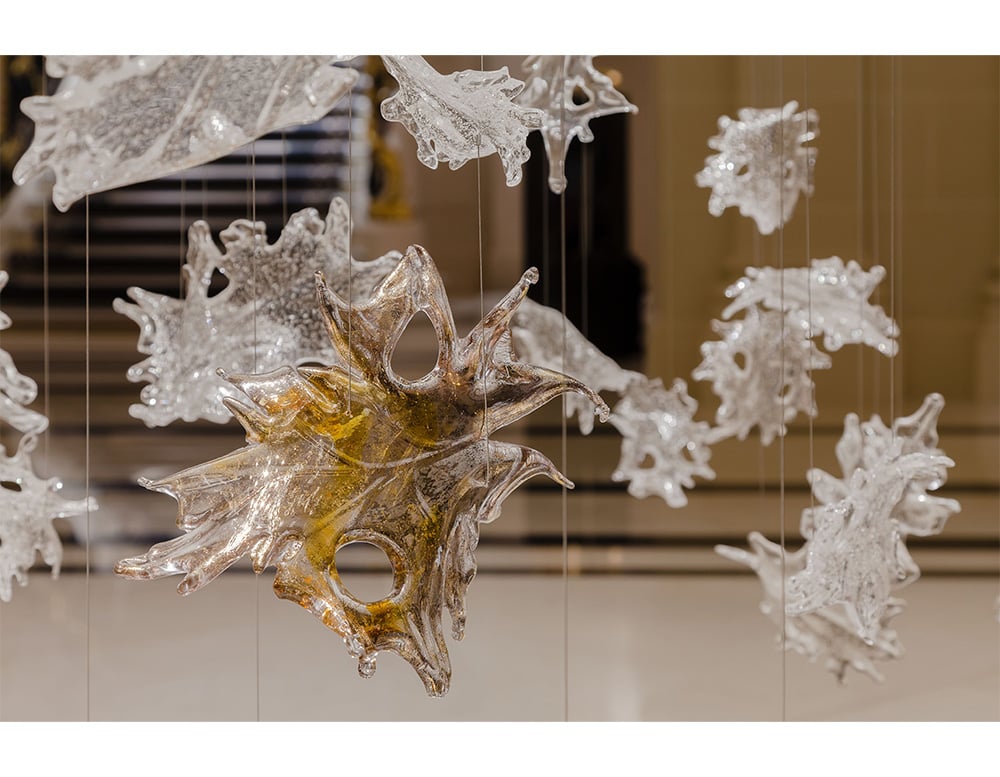 Dancing Leaves is one of the most famous LASVIT´s designs. The idea was a sculpture evoking the dancing leaves blown into the interior from the trees out front of the building.