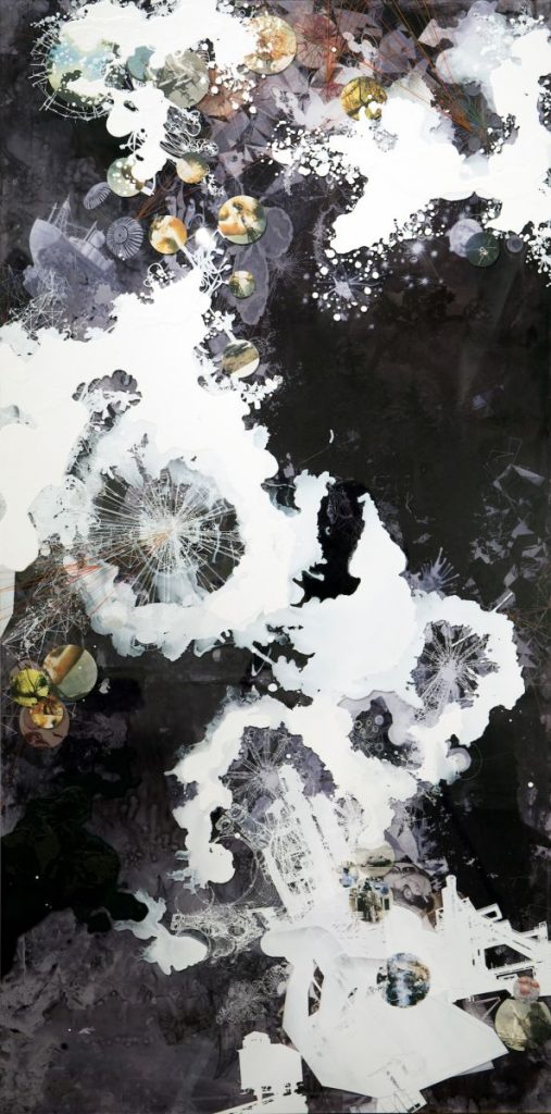 Acrylic, silkscreen, colored pencil and inkjet on plexiglass in black and white color tones