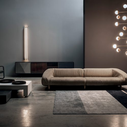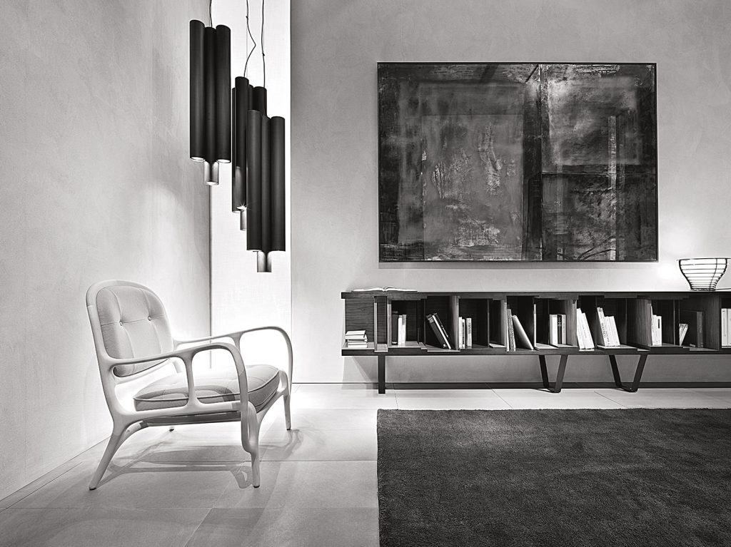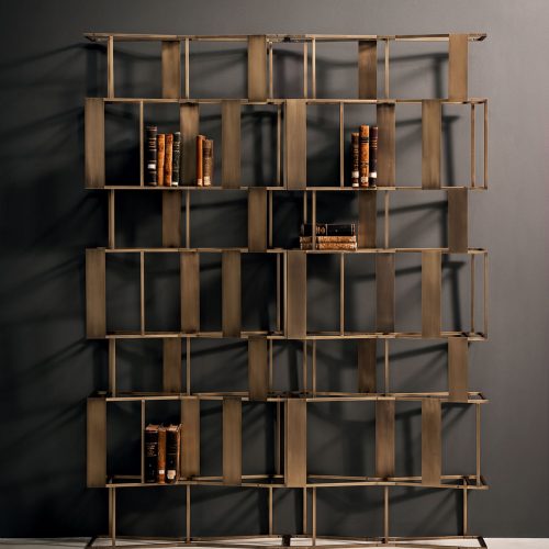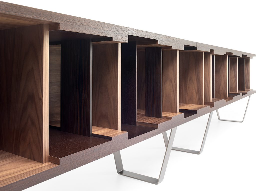 Modular bookcase in wenge, wall anchorage, internal in american walnut, partition panels in wenge, american walnut and ebony, base in steel burnished brass finish