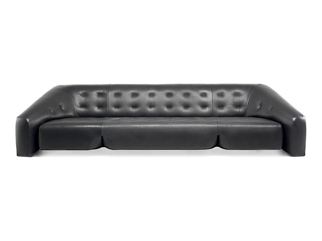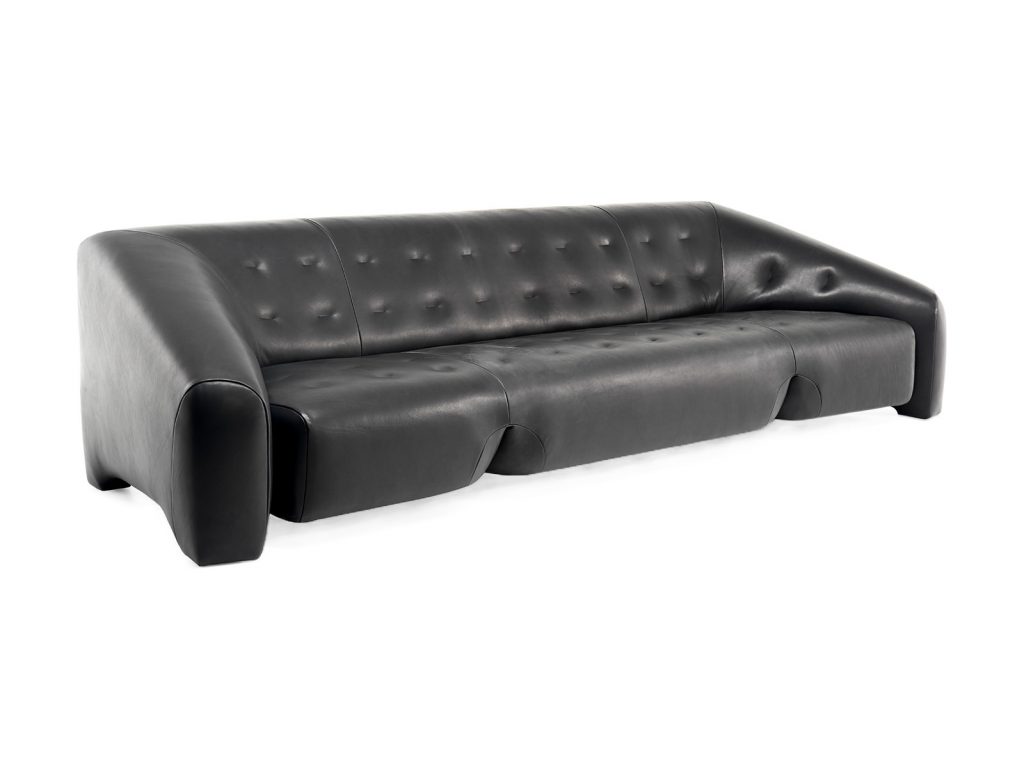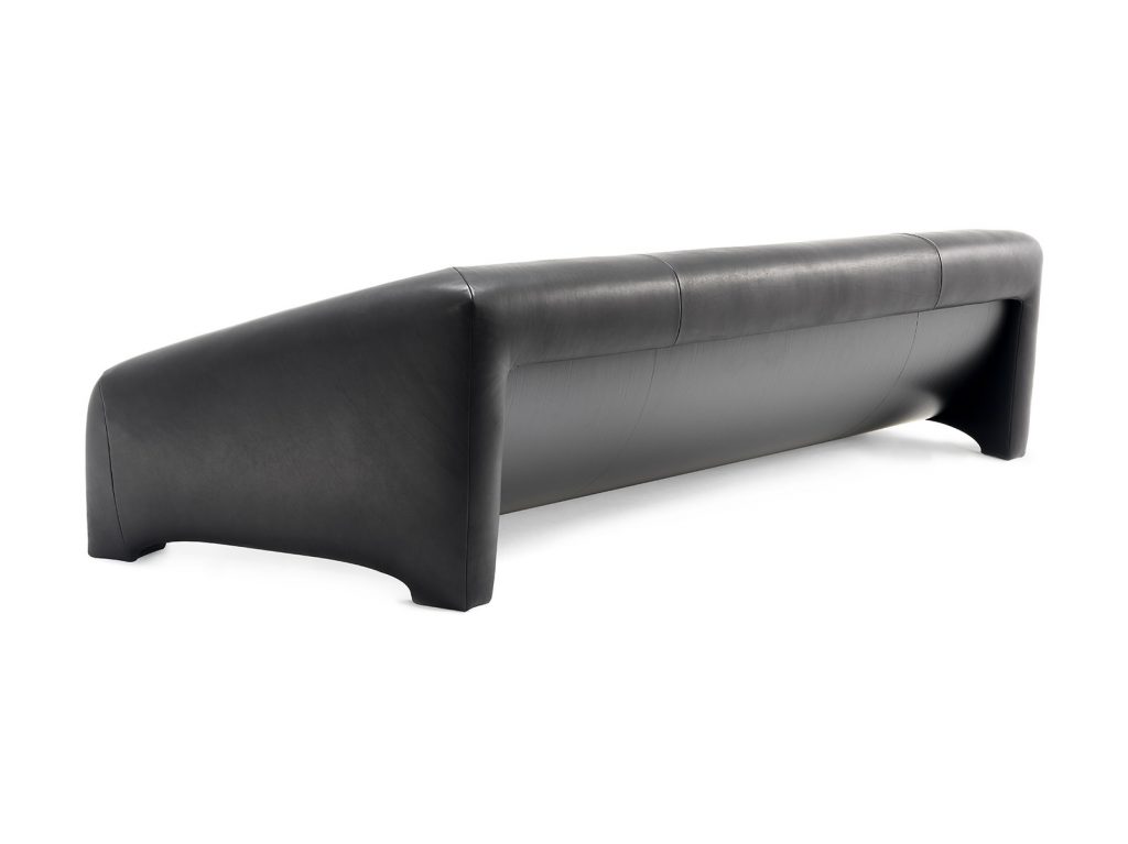 Sofa with base in solid wood and back-rest in curved plywood, rear back covered in saddle leather