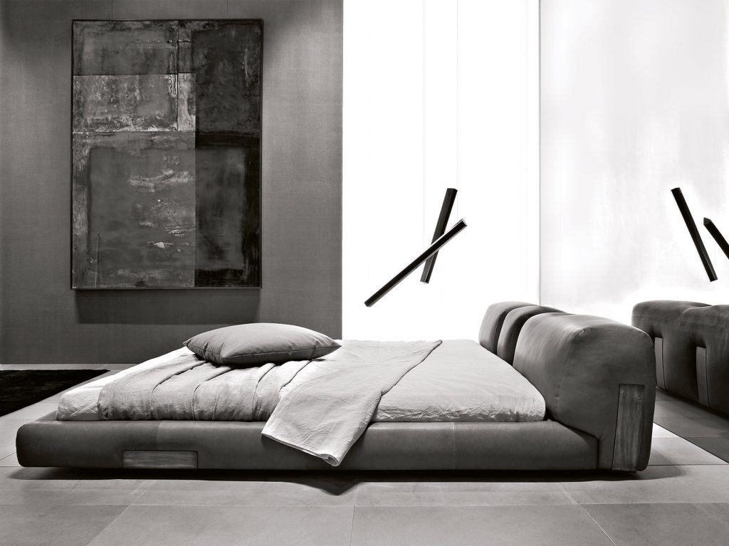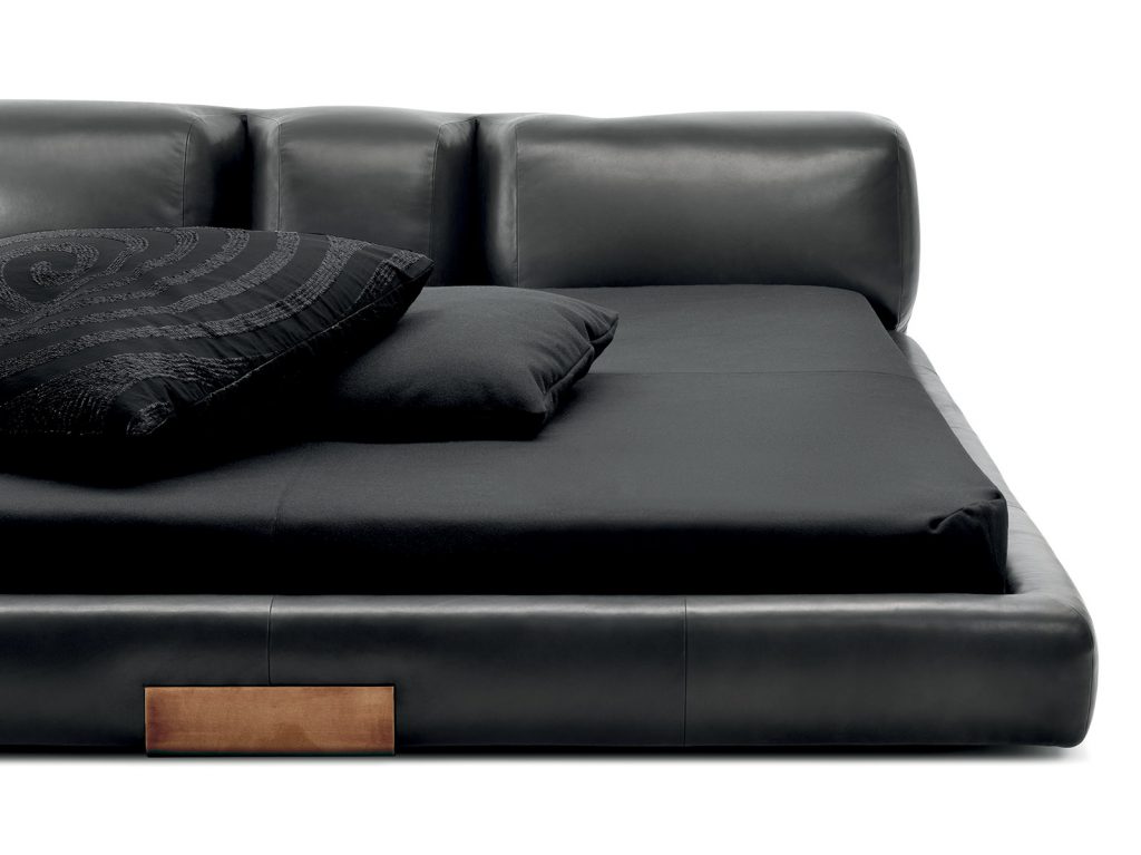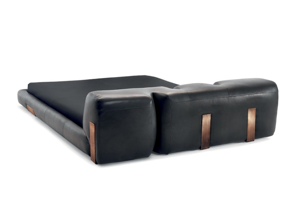Bed with headboard and bed frame in solid wood upholstered with non deformable polyurethane foam of various densities, protective cover in polyester fiber, metal parts in burnished brass. Bed base in beech slates.