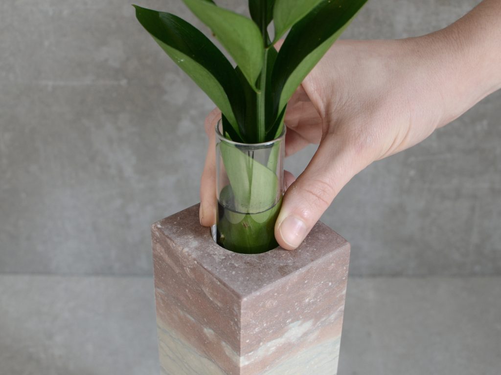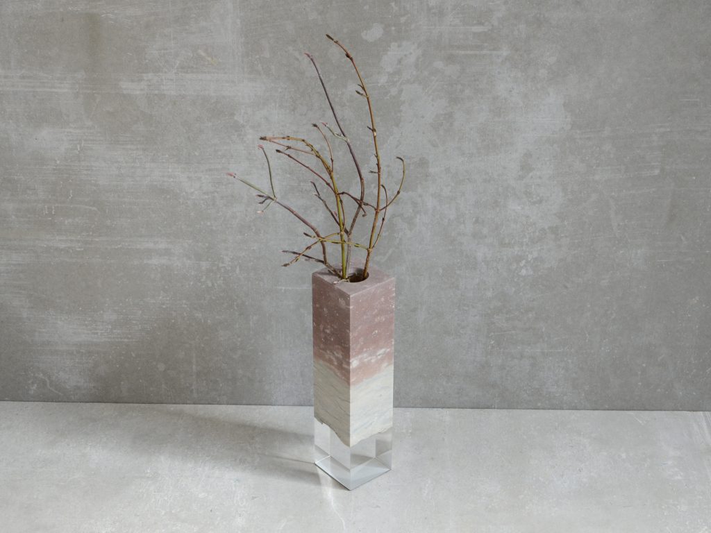 Natural Stone surface not covered by resin on the section planes. Selective stone coating with matt natural effect.Dolomyth _ Vase is made of DOLOMITYH ROCK which its natural rough surface with mosses and lichens, preserved in EXTRACLEAR RESIN resembling the water that generated their life.