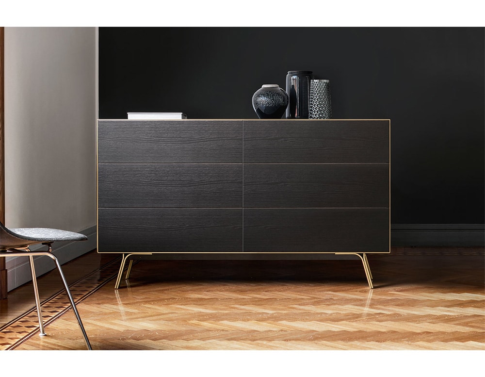 Essential, generous volumes, underlined by 45° joints, are the distinguishing features of the Domino collection. The angulation adopted for the system emphasises the solid appearance of the storage units, softened by slim indentations that on the veneered version may be highlighted by a contrasting finish, or practically disappear with a tone on tone finish. The addition of tapered metal legs will add further appeal.